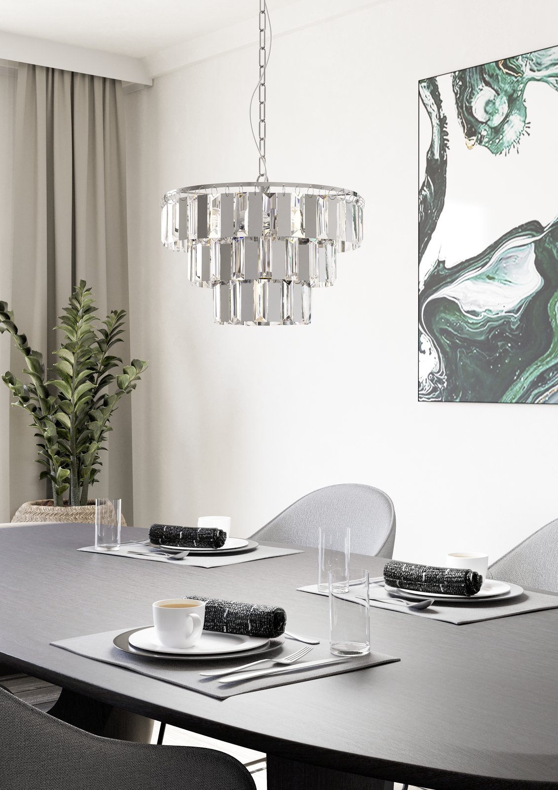 Moderne und elegante Kristalllampen aus Stahl und Kristall. Sie eignen sich für Wohnzimmer, aber auch für Küchen, Esszimmer, Büros oder Eingangsbereiche. Es hat ein sehr luxuriöses Gefühl. |
