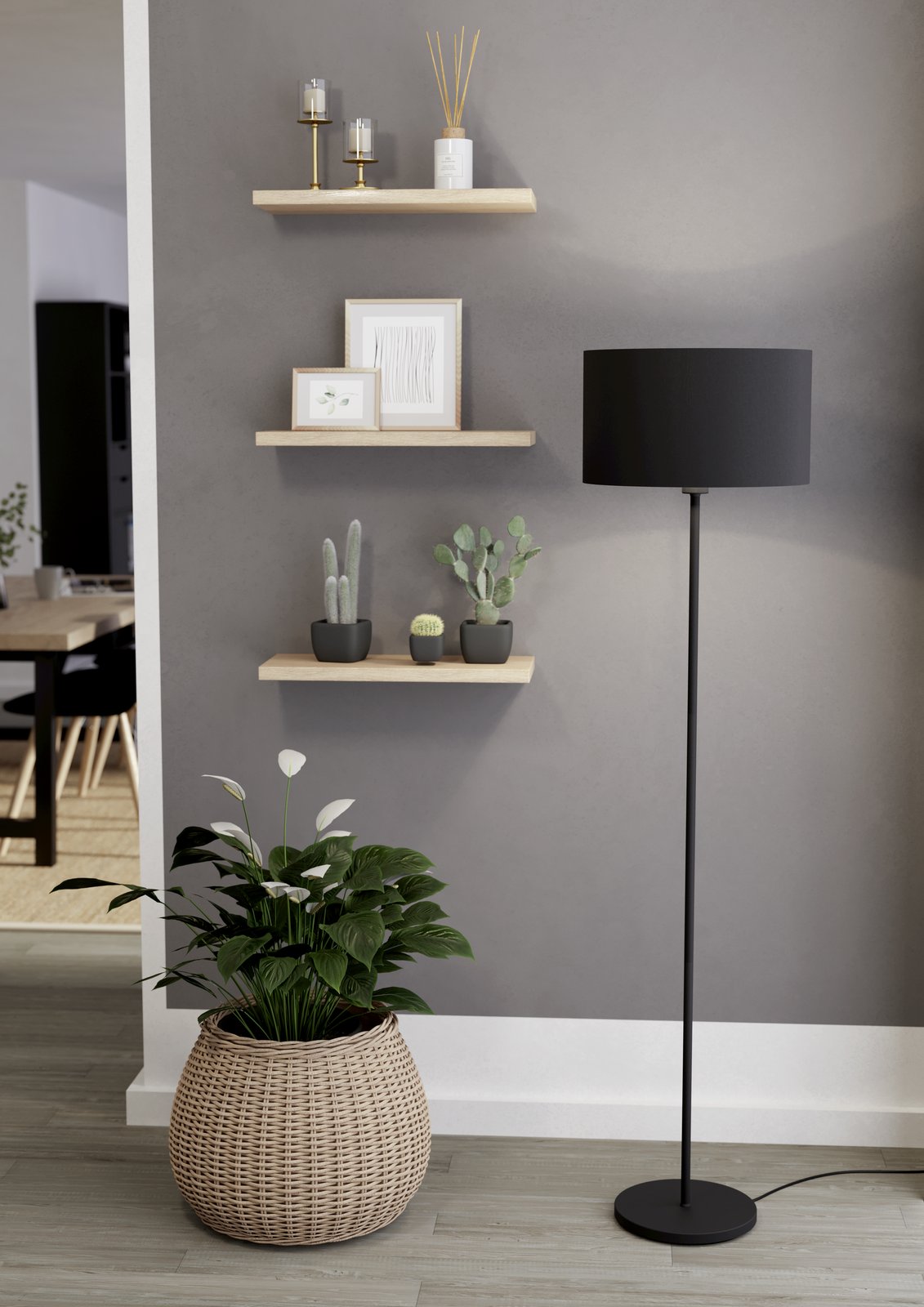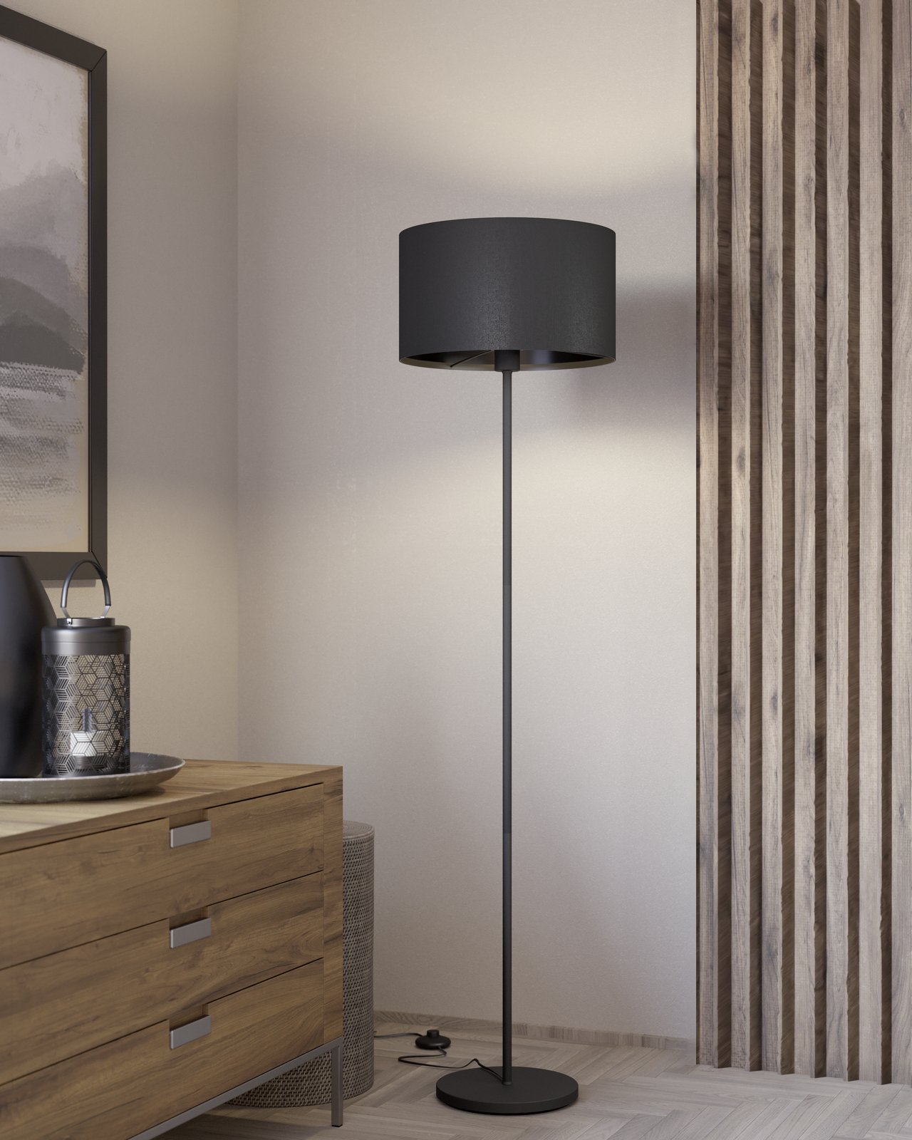 Schlichte, aber moderne Lampe und Tischleuchte aus Stahl und Textil in schwarzer Farbe. Kombinieren Sie sie mit den anderen Lampen aus dem Maserlo-Schwarz-Set und Sie erhalten einen kompletten Innenraum-Look. |