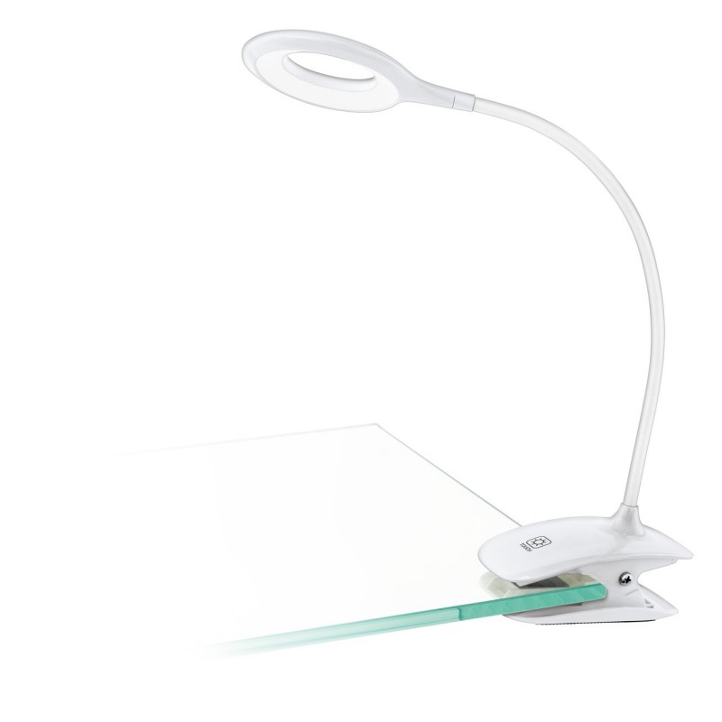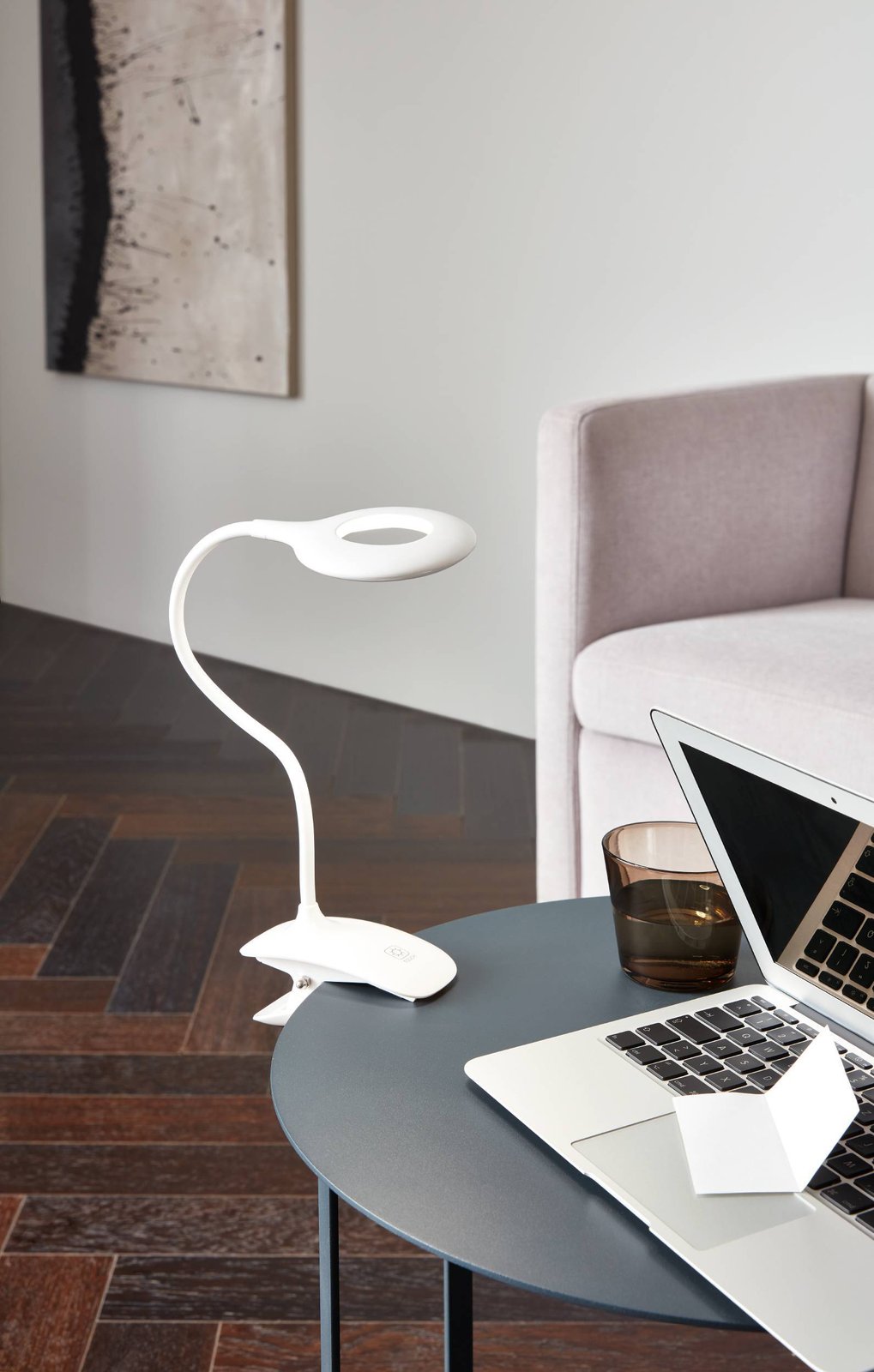 Die Büroleuchte mit Clip lässt sich ganz einfach auf einem Tisch oder Regal platzieren. Neben Büros eignet es sich auch für Kinder- oder Studentenzimmer. Es besteht aus weißem Kunststoff.