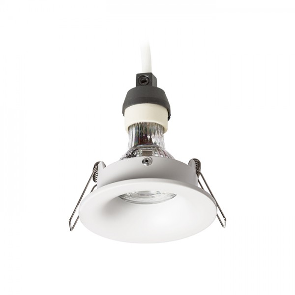 Badezimmereinbauleuchte für Gipskartondecken mit abgerundetem Reflektor. |