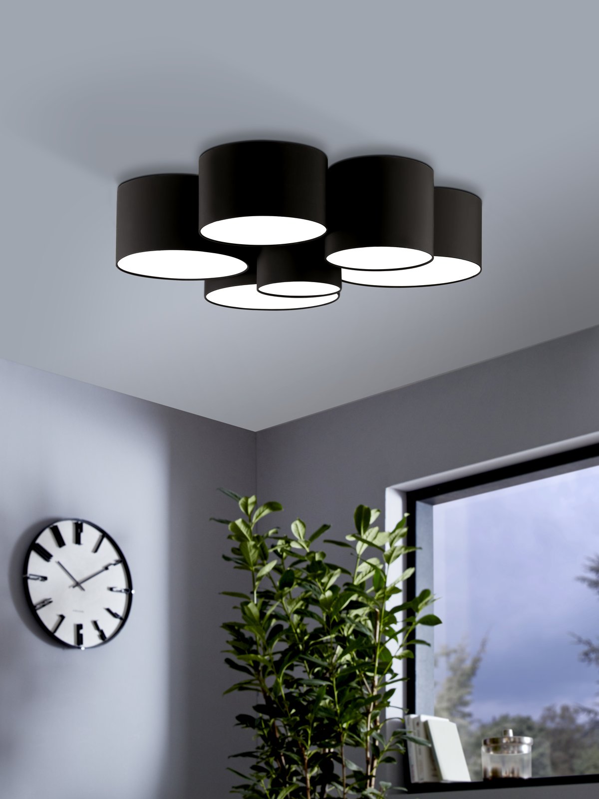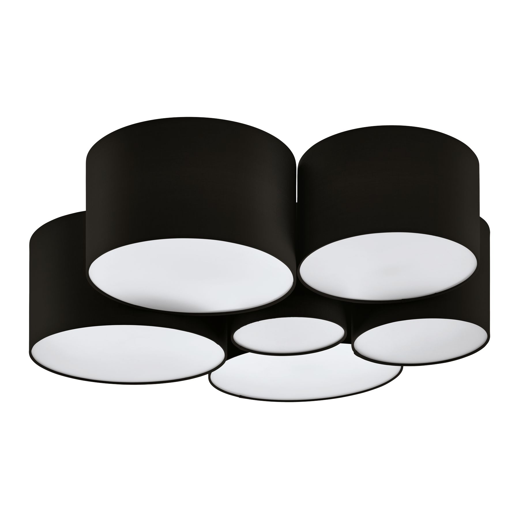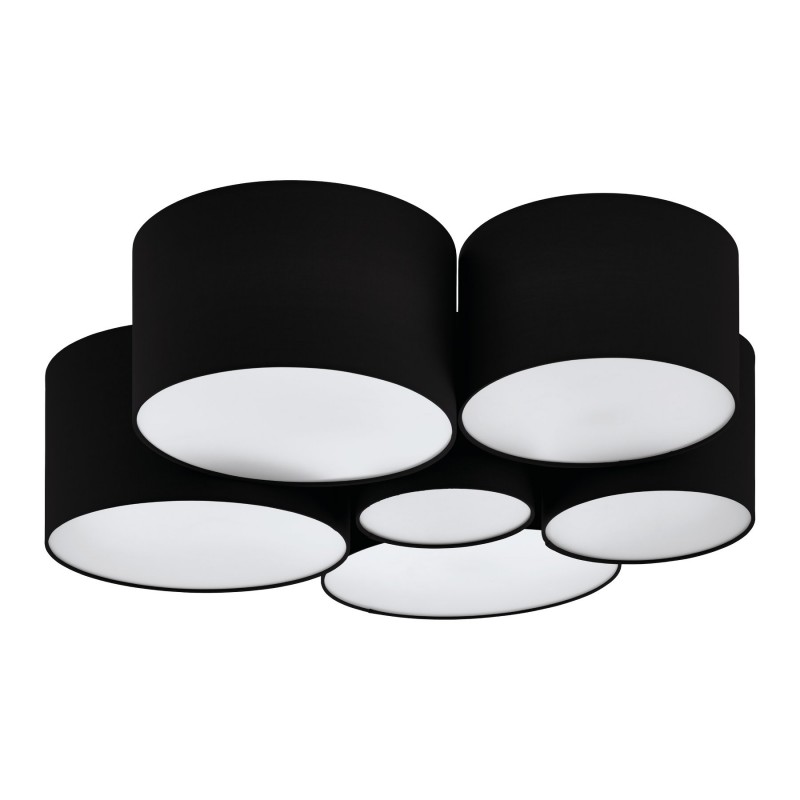 Sehr moderne Deckenleuchten verbunden aus mehreren runden Leuchten. Sie bestehen aus Stahl in weißer Farbe und Textil in schwarzer Farbe. Es besteht die Möglichkeit, sie mit einer intelligenten LED-Glühbirne auszustatten und die Farbe und Intensität der Beleuchtung zu ändern.