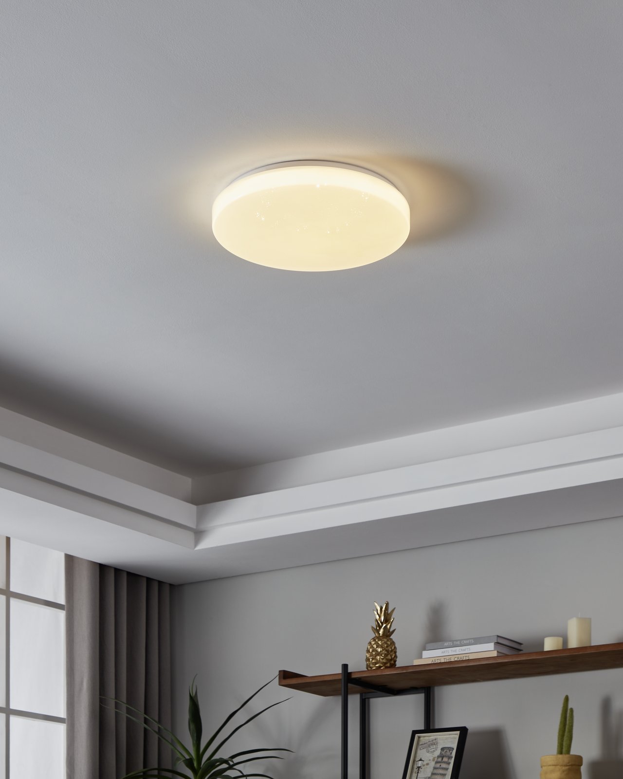 Die runden Deckenleuchten bestehen aus Stahl in weißer Farbe und Kunststoff in weißer Farbe. Mit seinem schlichten Design eignet es sich für Wohnzimmer, Küchen, aber auch Büros und Kinderzimmer.