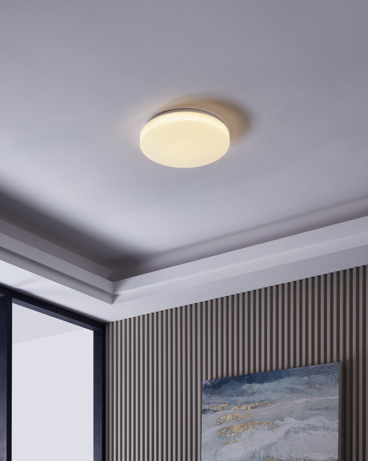 Die runden Deckenleuchten bestehen aus Stahl in weißer Farbe und Kunststoff in weißer Farbe. Mit seinem schlichten Design eignet es sich für Wohnzimmer, Küchen, aber auch Büros und Kinderzimmer.
