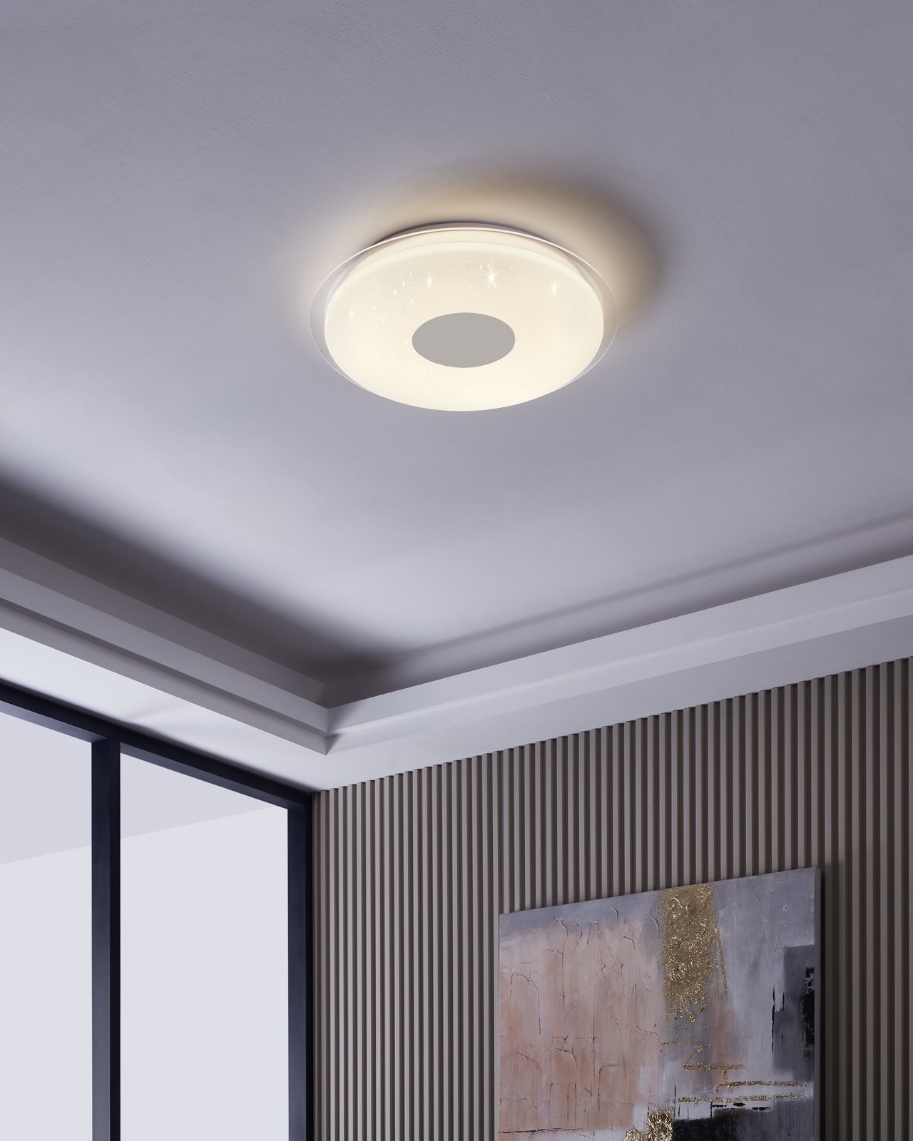 Smarte Deckenleuchte mit Steuerung per Smartphone per ZigBee-App, Bluetooth oder Fernbedienung. Die Lampen bestehen aus Stahl in weißer und transparenter Farbe und Kunststoff in weißer Farbe mit Glitzereffekt.