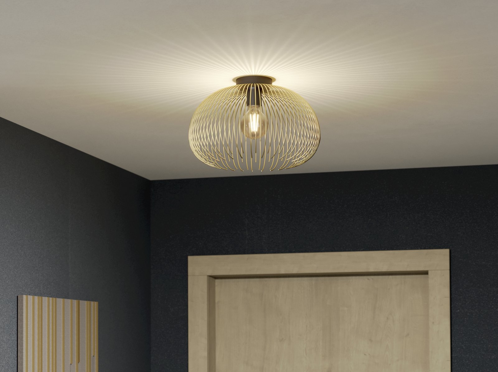 Moderne und stilvolle Lampen aus Stahl in Schwarz und Gold. Der Schirm besteht aus Stahldrähten in Form einer Kugel. Nach dem Einschalten dringt das Licht durch den Schirm, was sehr effektvoll wirkt. Sie eignen sich für Wohnzimmer, Küchen, Esszimmer und sogar Schlafzimmer. |