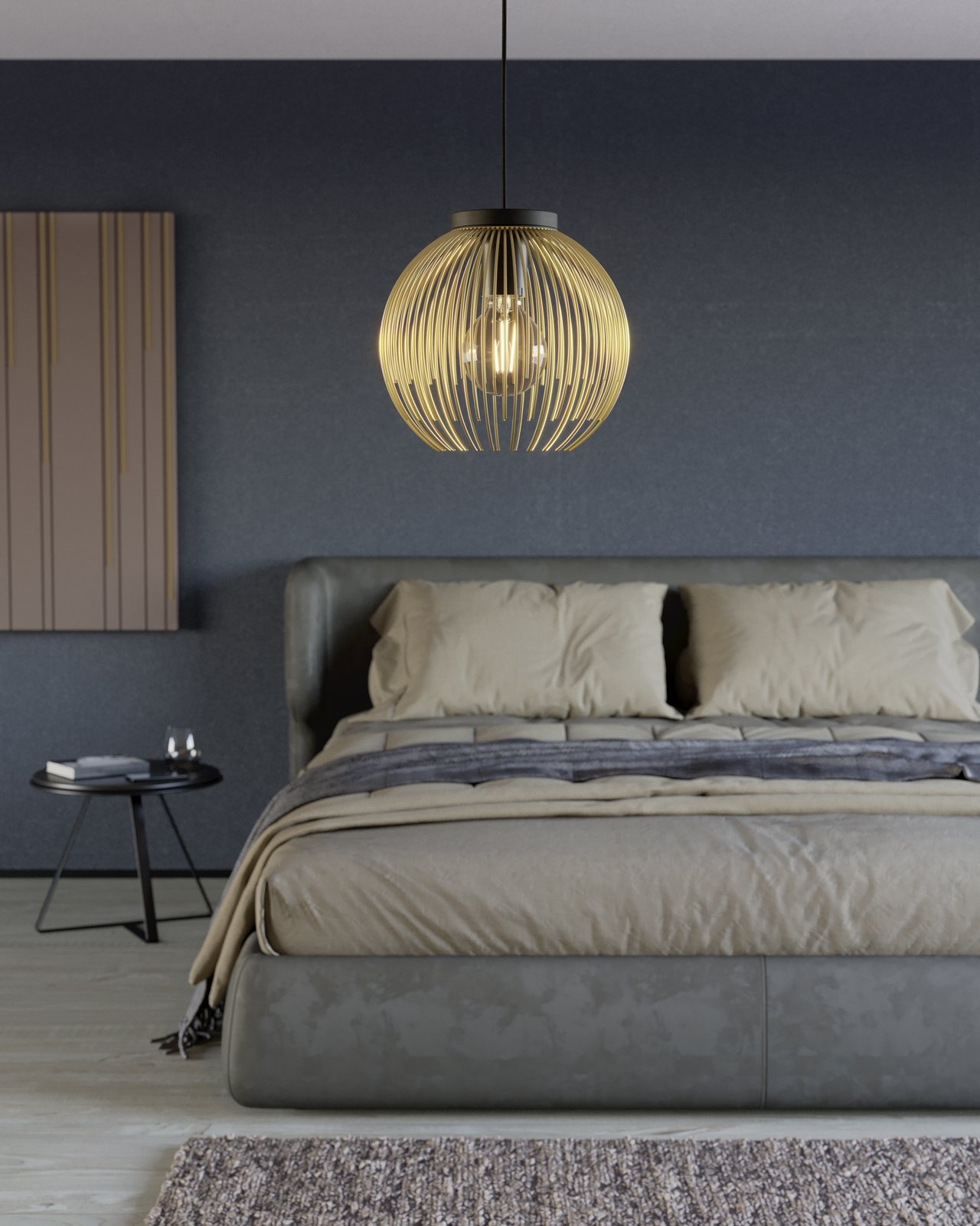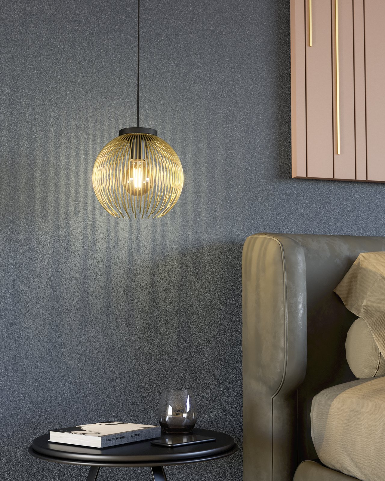 Moderne und stilvolle Lampen aus Stahl in Schwarz und Gold. Der Schirm besteht aus Stahldrähten in Form einer Kugel. Nach dem Einschalten dringt das Licht durch den Schirm, was sehr effektvoll wirkt. Sie eignen sich für Wohnzimmer, Küchen, Esszimmer und sogar Schlafzimmer. |