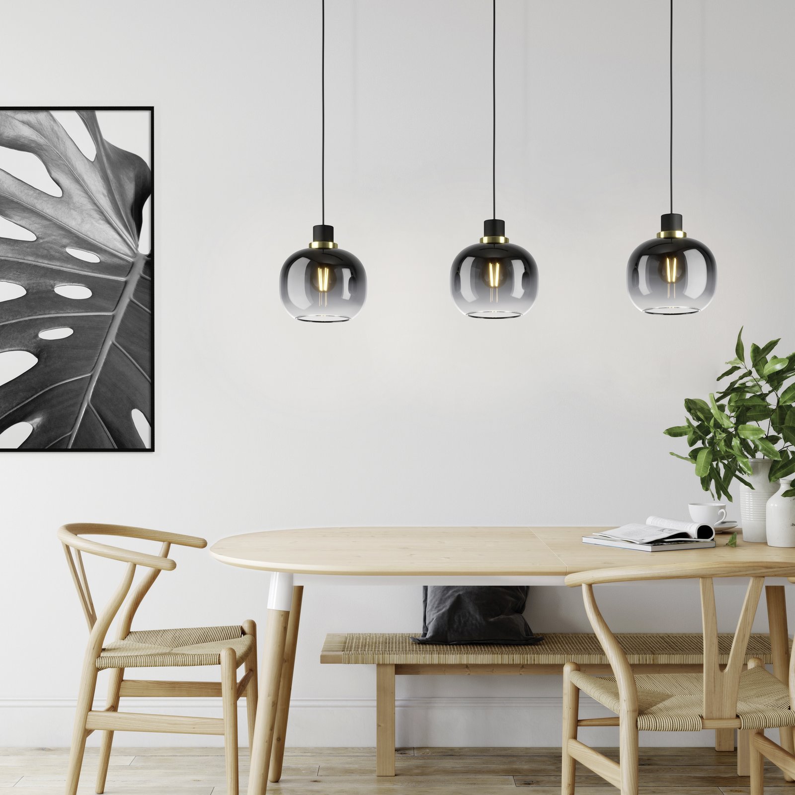 Nowoczesne lampy wiszące Oiella nadają się do kuchni i jadalni, ale także do salonów. Podstawa wykonana jest ze stali w kolorze czarnym i mosiądzu, a klosz ze szkła w kształcie kuli. |