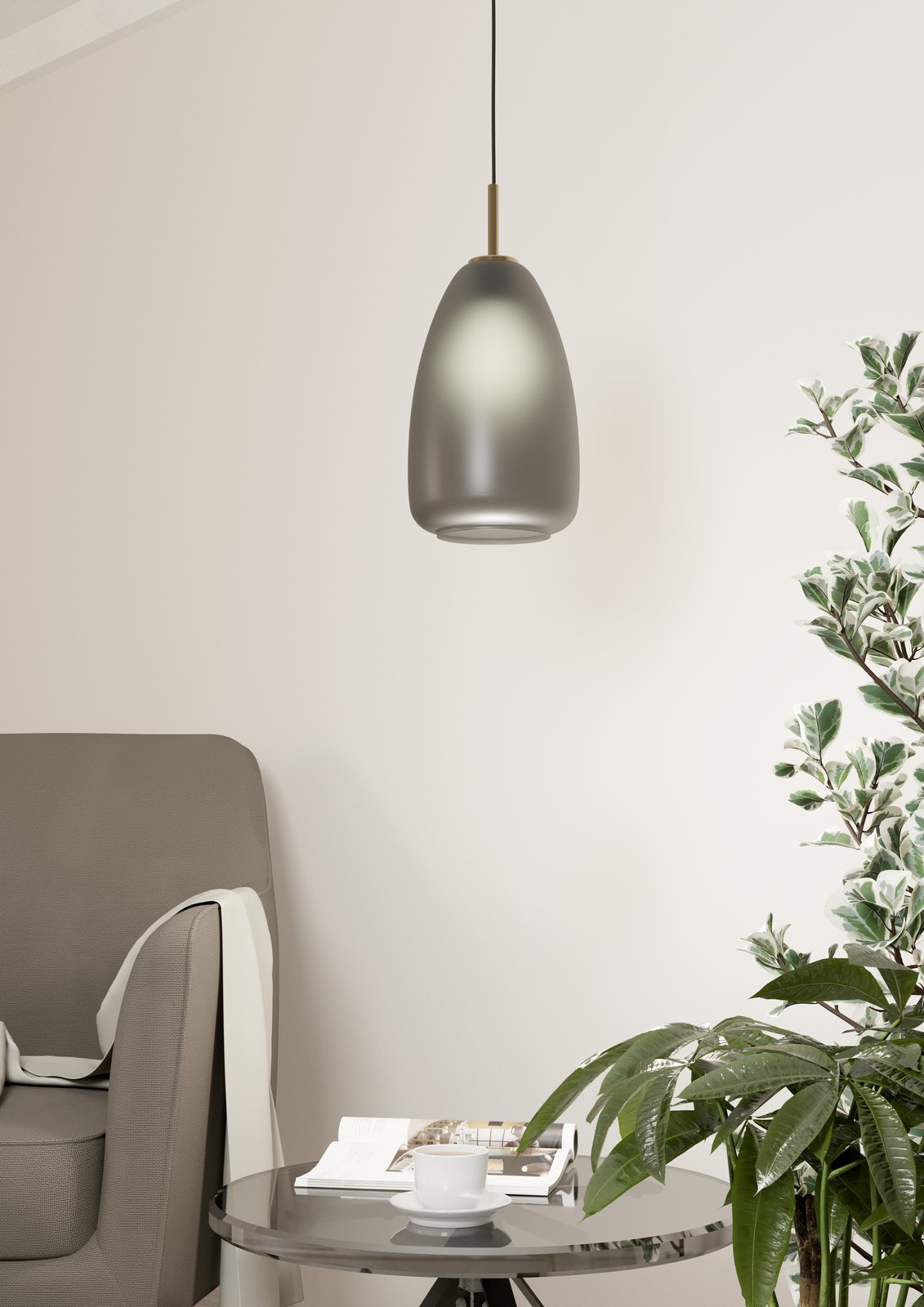 Moderne Kronleuchter aus Stahl in schwarzer Farbe, Lampenschirme aus Glas in mattgrauer Farbe mit einem Messingelement. Sie eignen sich besonders für Küchen und Esszimmer, über dem Esstisch oder der Kücheninsel. |