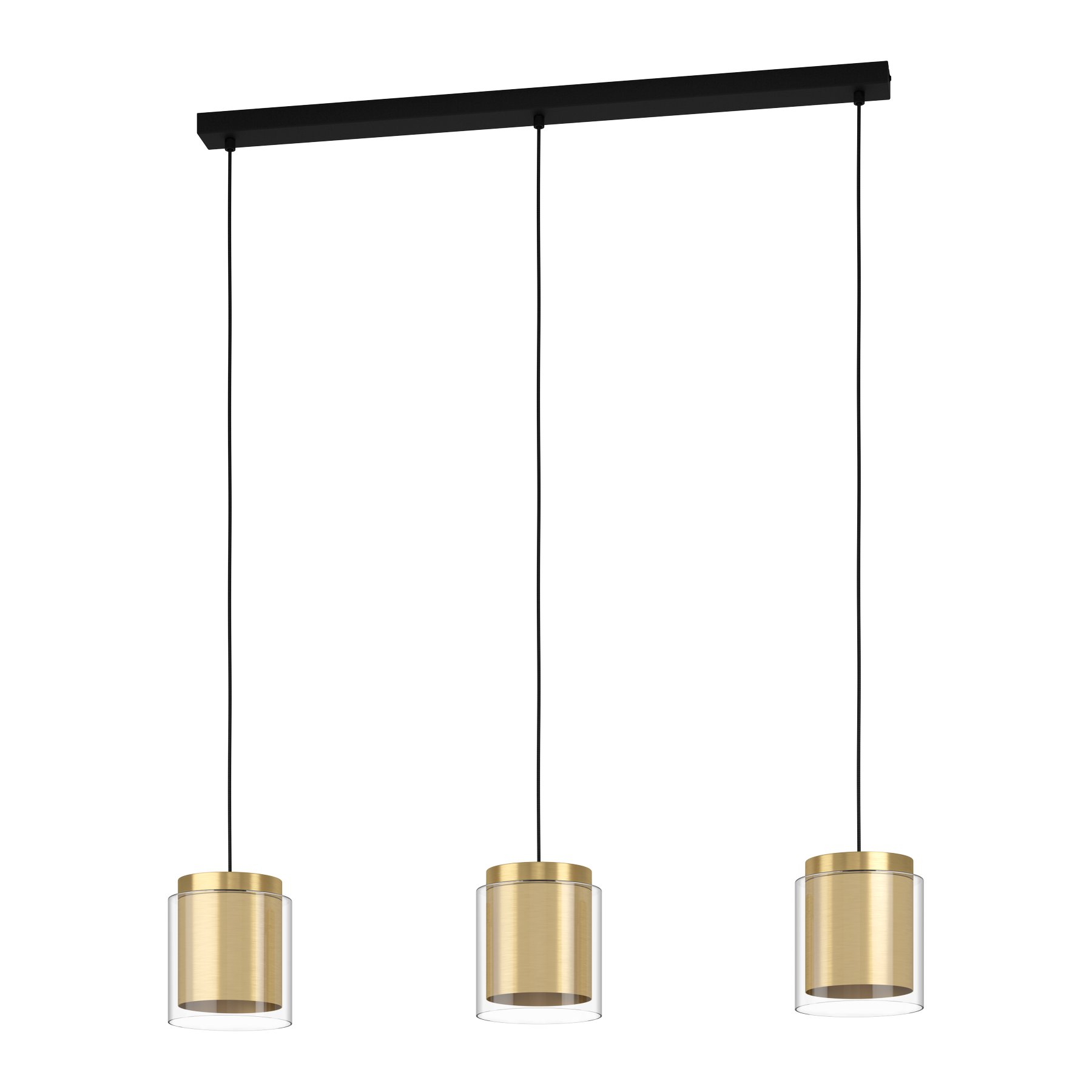 Moderne Pendelleuchten geeignet für Wohnzimmer, Küchen über der Kücheninsel und Esszimmer über dem Esstisch. Der Sockel besteht aus Stahl in schwarzer Farbe, das Scharnier aus Stahl in Messing- und Goldfarbe und aus Glas in klarer Farbe. |