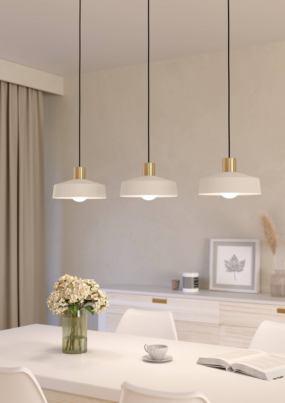 Moderne Pendelleuchten aus sandfarbenem Stahl mit Messingelementen. Es besteht die Möglichkeit, sie mit smarten LED-Leuchtmitteln auszustatten und diese über eine Smartphone-App zu dimmen sowie die Temperatur und Farbe der Beleuchtung zu ändern. Sie eignen sich nicht nur für Küchen und Esszimmer, sondern auch für Wohnzimmer. |