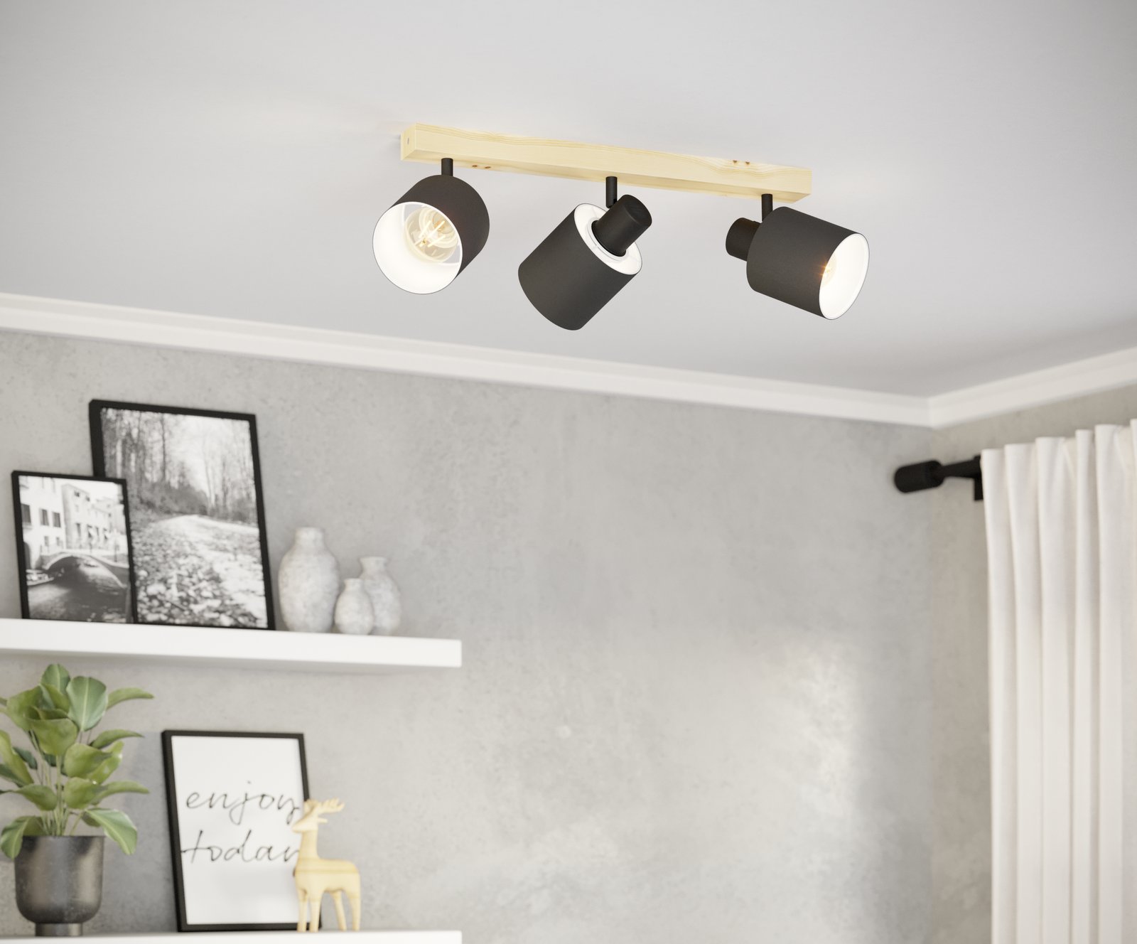 Elegante Strahler aus Stahl in Schwarz, Holz in Braun und Textil in Schwarz und Weiß. Sie eignen sich für Wohnzimmer, Schlafzimmer, Flure und Flure. Der Vorteil dieser Lampen besteht darin, dass sie neigbare Köpfe haben, sodass Sie dort leuchten können, wo Sie es benötigen.