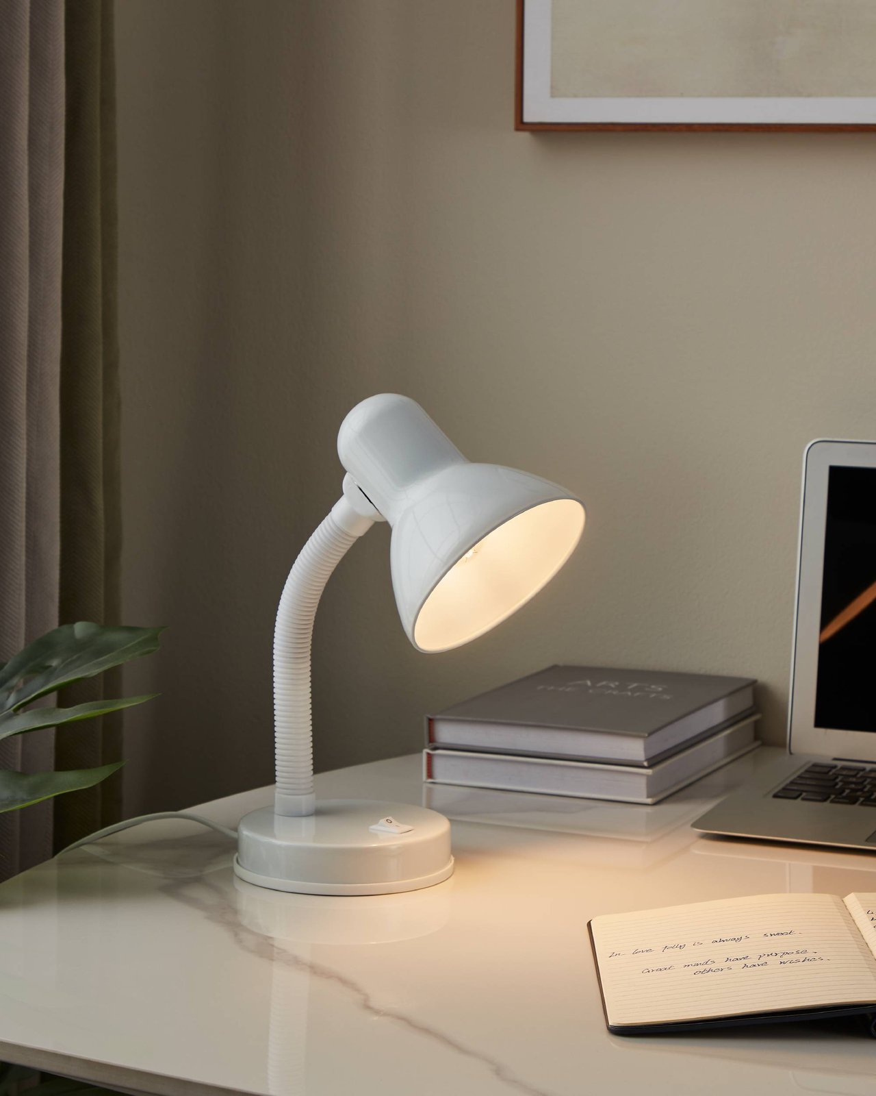 Eine einfache Lampe, die für ein Kinderzimmer oder ein Büro geeignet ist. Es besteht aus Kunststoff und Stahl. Die Lampe verfügt über einen flexiblen Hals, sodass sie je nach Bedarf so eingestellt werden kann, dass sie dort leuchtet, wo sie benötigt wird. |