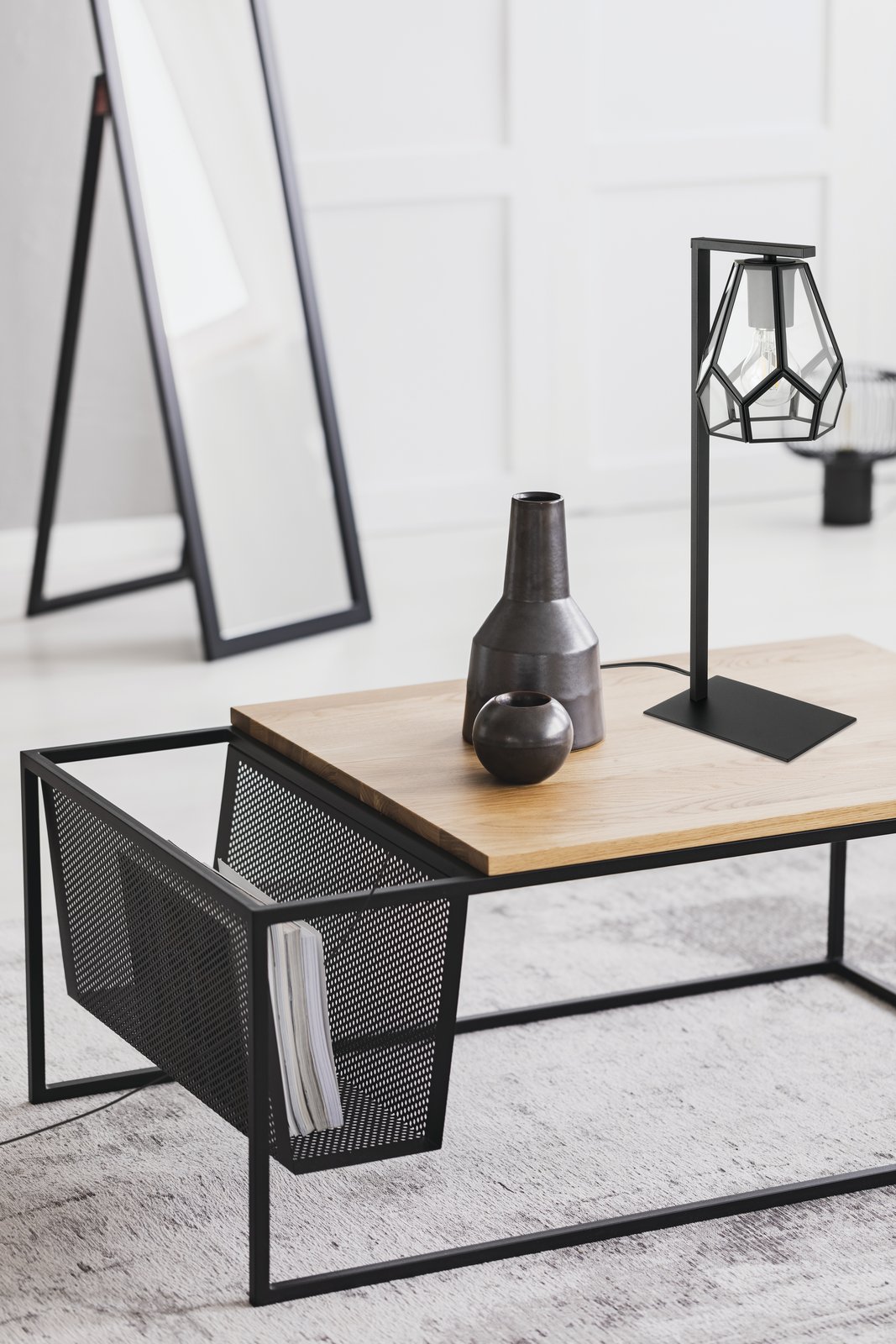 Eine stilvolle Lampe, die zum Markyde-Beleuchtungsset gehört. Es besteht aus schwarzem Stahl und klarem Glas. |