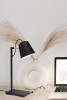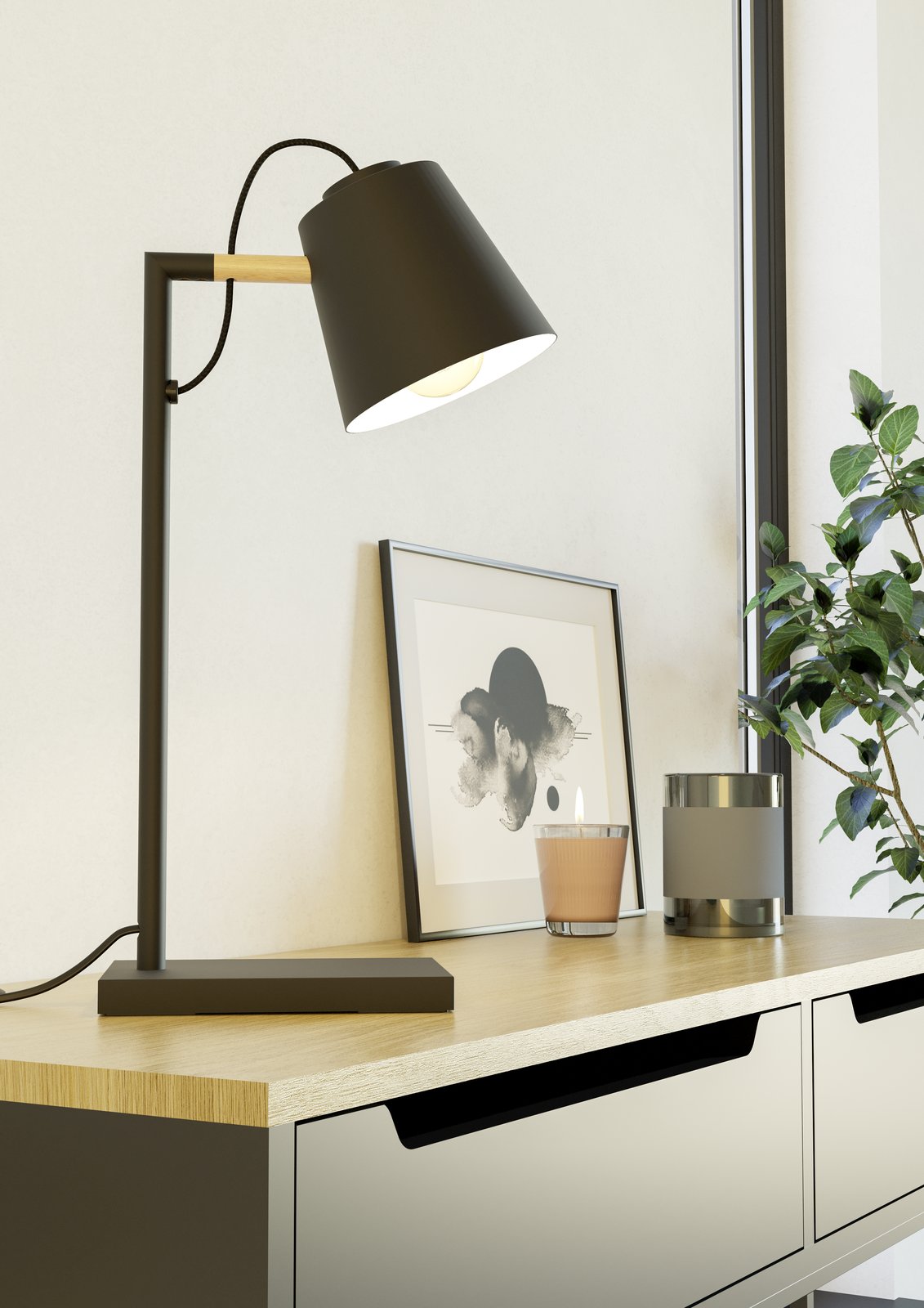 Lampe und Tischleuchte im modernen Stil. Sie bestehen aus schwarzem Stahl mit einer Kombination aus Holzelementen. Der Hut besteht aus Stahl in Schwarz und Creme. |