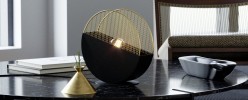 Eine stilvolle und moderne Lampe, die für einen Couchtisch oder eine Kommode im Wohnzimmer geeignet ist und eine angenehme Atmosphäre schafft. Es hat die Form eines Kreises und ist aus Stahl in Schwarz und Gold gefertigt. |