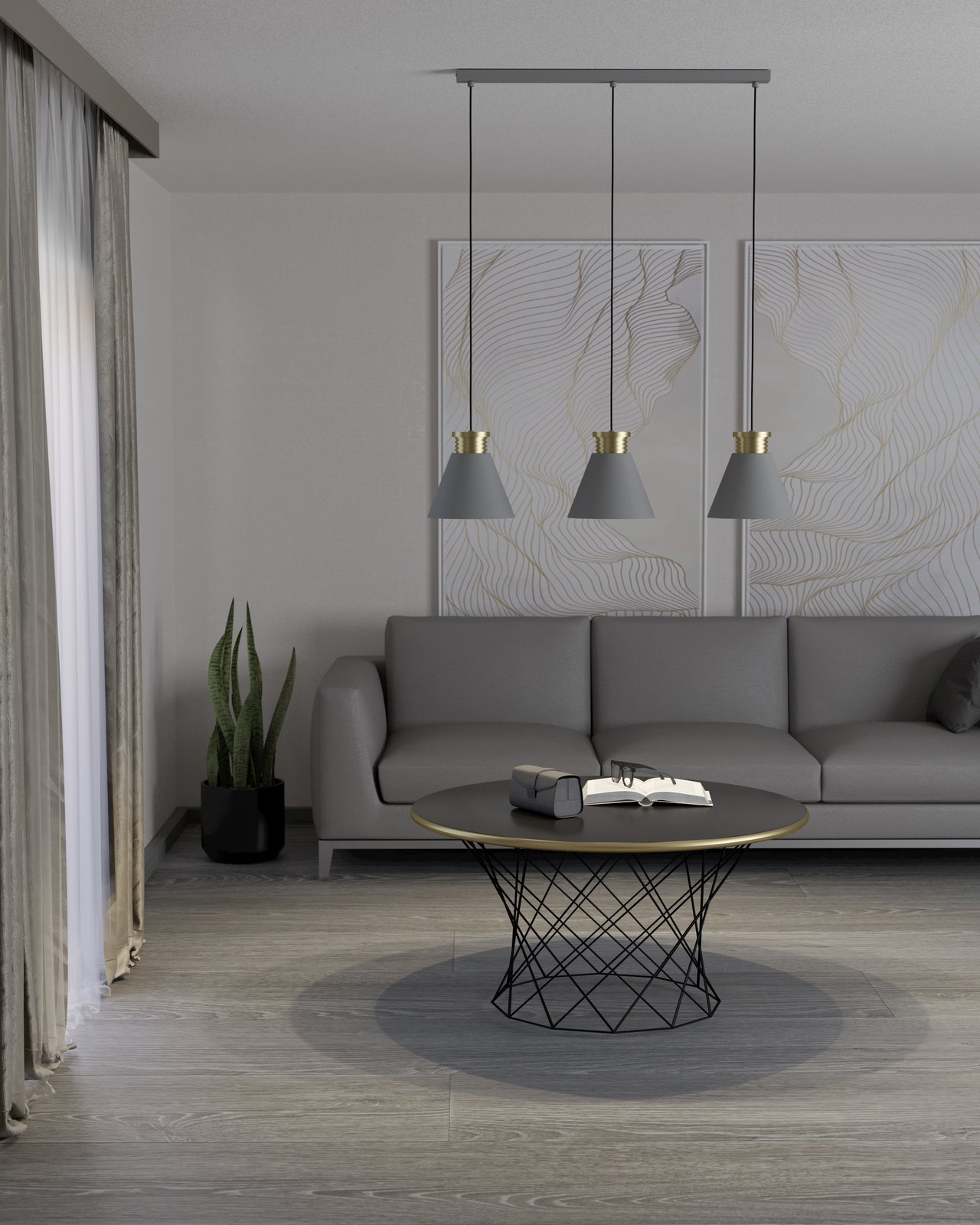 Schlichte Lampen aus Stahl in grauer Farbe mit goldenem Element. Es eignet sich für Wohnzimmer, Küchen und Esszimmer sowie Schlafzimmer und Flure. |
