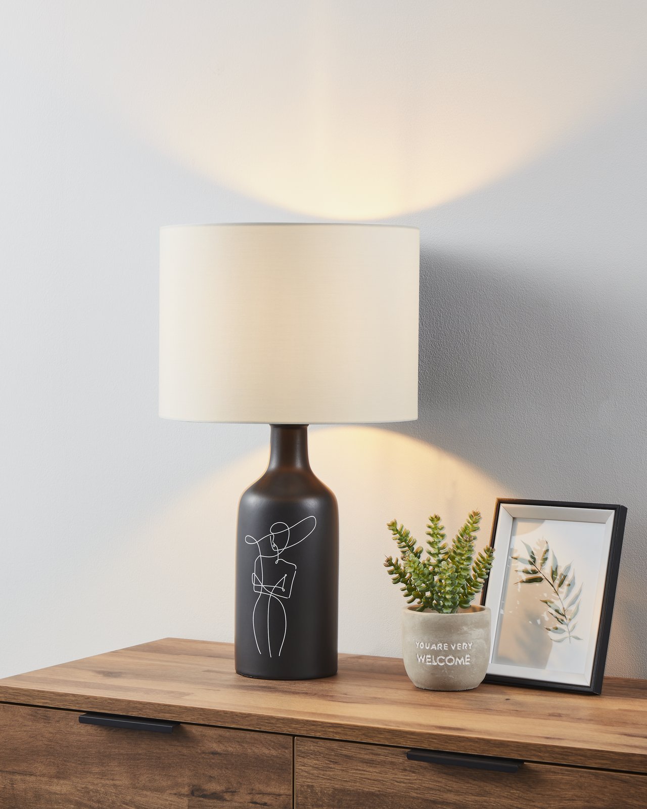 Moderne und elegante Lampen passend für das Wohn- oder Schlafzimmer auf der Kommode oder dem Nachttisch. Sie bestehen aus Keramik mit einfacher Zeichnung und Textil. |