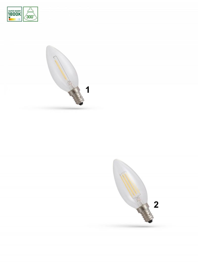 Glühbirne mit E14-Gewinde Typ CANDLE - energieeffizienter dank der Verwendung von langlebigen COG-Fäden, die sehr wenig Strom verbrauchen. Sie leuchtet mit einem superwarmen Licht, das Entspannung und Ruhe fördert und den beleuchteten Raum gemütlich macht. |