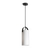 Hängende Designerlampe mit zylindrischem Opalglas. Lackierte Metallelemente, schwarzes Textilkabel. Er fällt vor allem in der Küche über der Kücheninsel, im Esszimmer über dem Esstisch, aber auch im Wohn- oder Schlafzimmer auf.