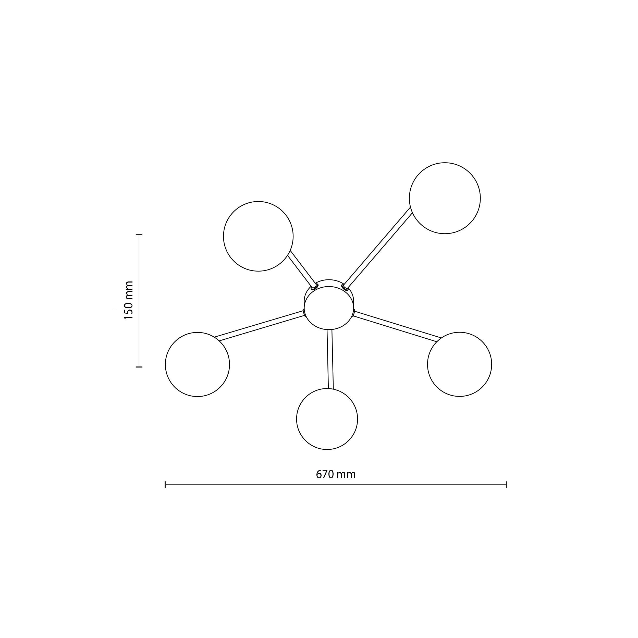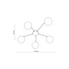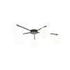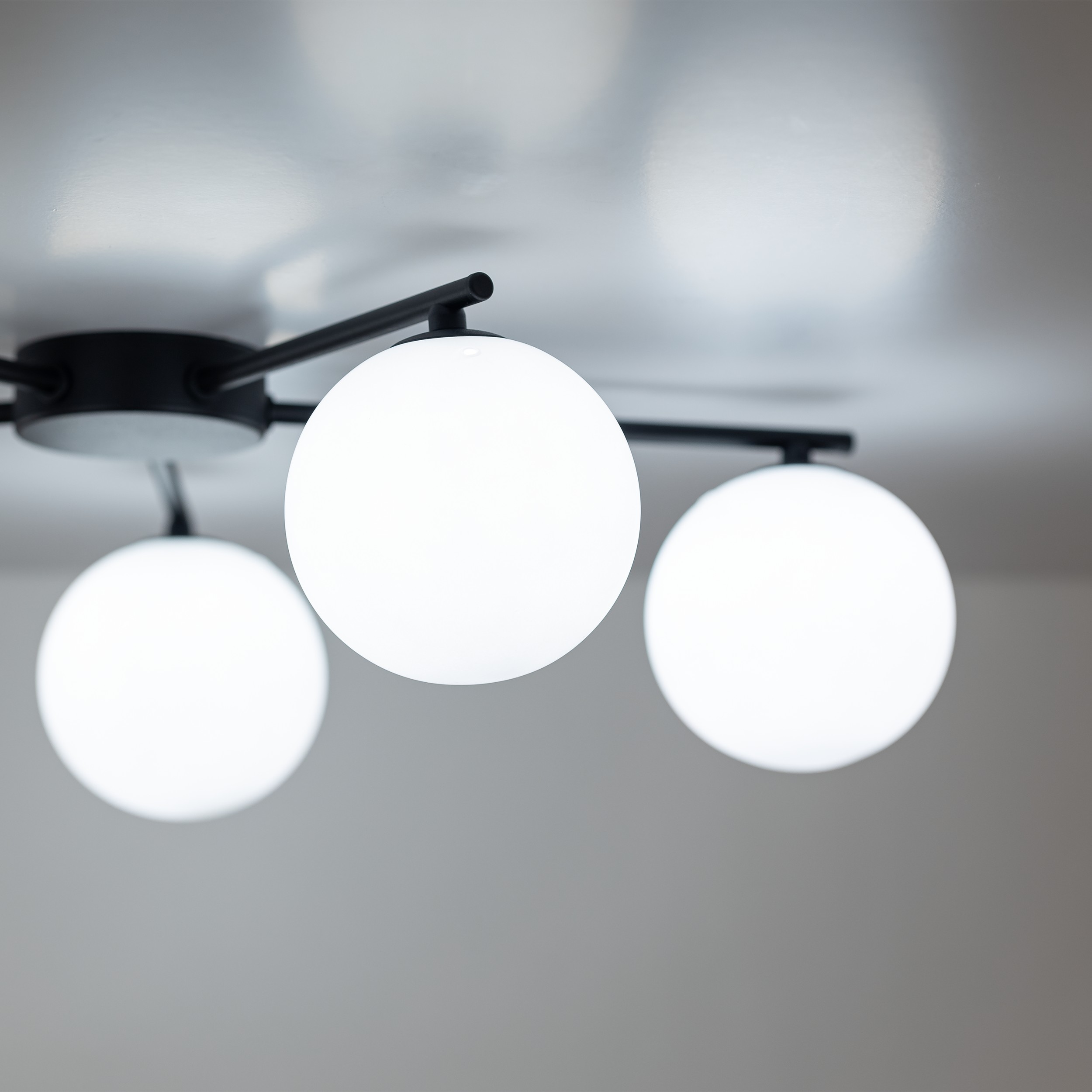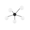 Moderne Deckenleuchten aus Metall, Glas und Kunststoff in elegantem Schwarz. Der Metallfuß hat Arme, an denen Glaskugeln aufgehängt sind. |