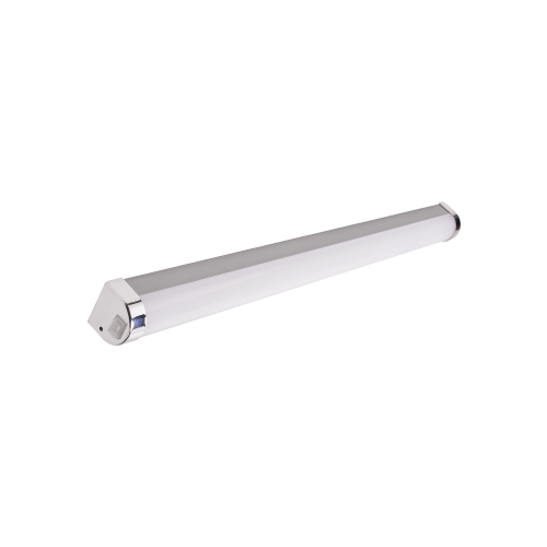 Badezimmerlampe über dem Spiegel aus Kunststoff in Chromfarbe und Acryl in Weiß. Mit einem Schalter.