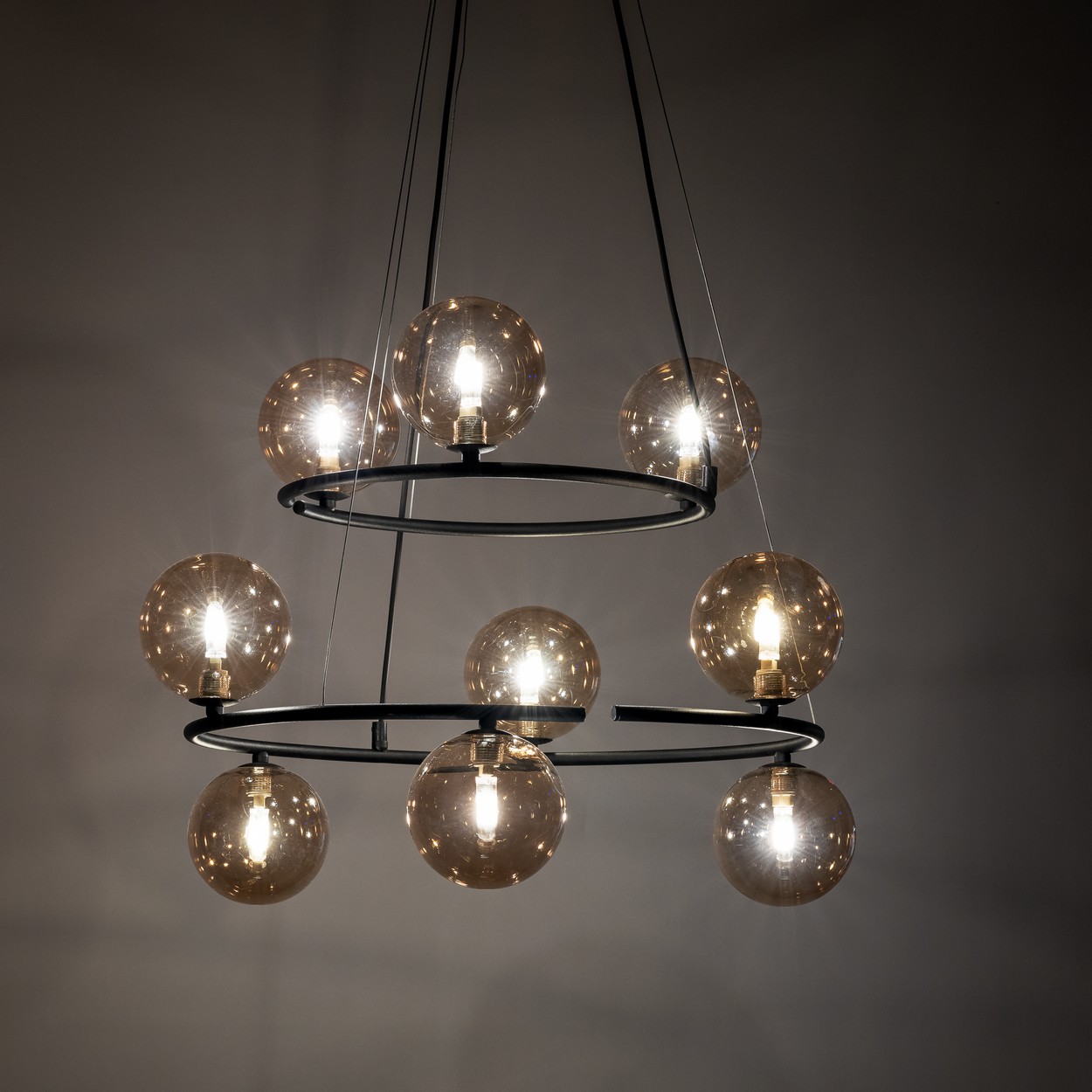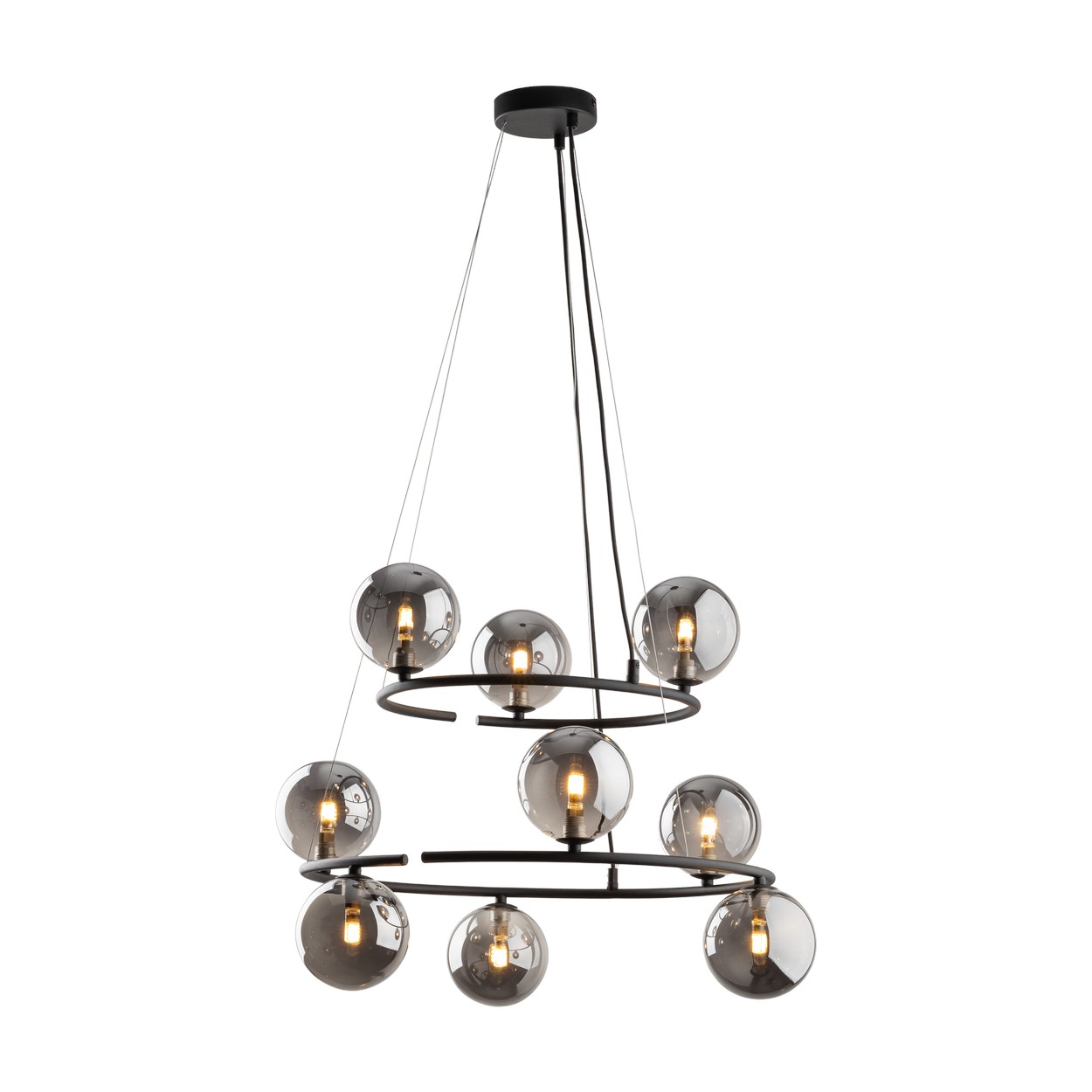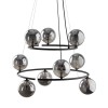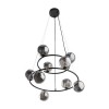 Interessante Kronleuchter aus Metall, Kunststoff und Glas. Es hat ein luxuriöses Gefühl. Sie werden ein interessantes Element in Ihrem Interieur bilden. Auf dem schwarzen Sockel sind schwarze Glaskugeln platziert. |