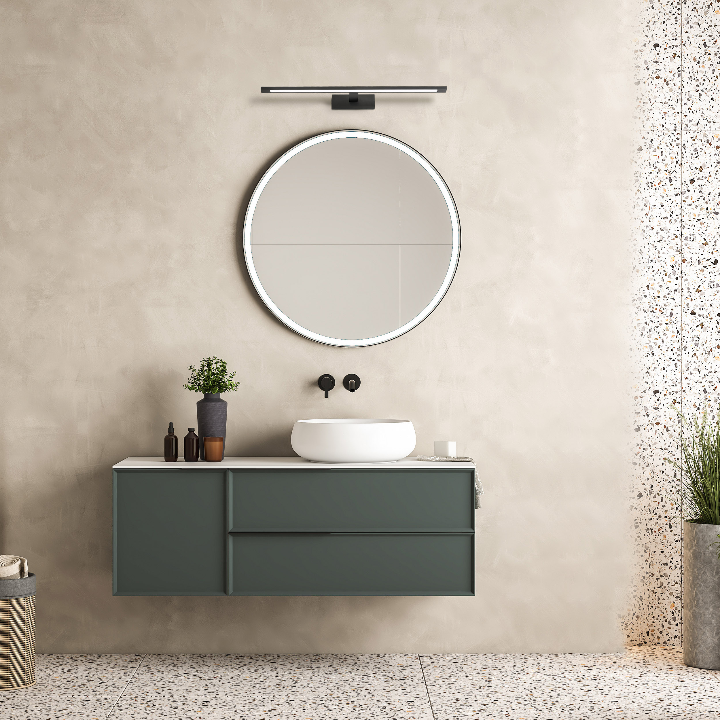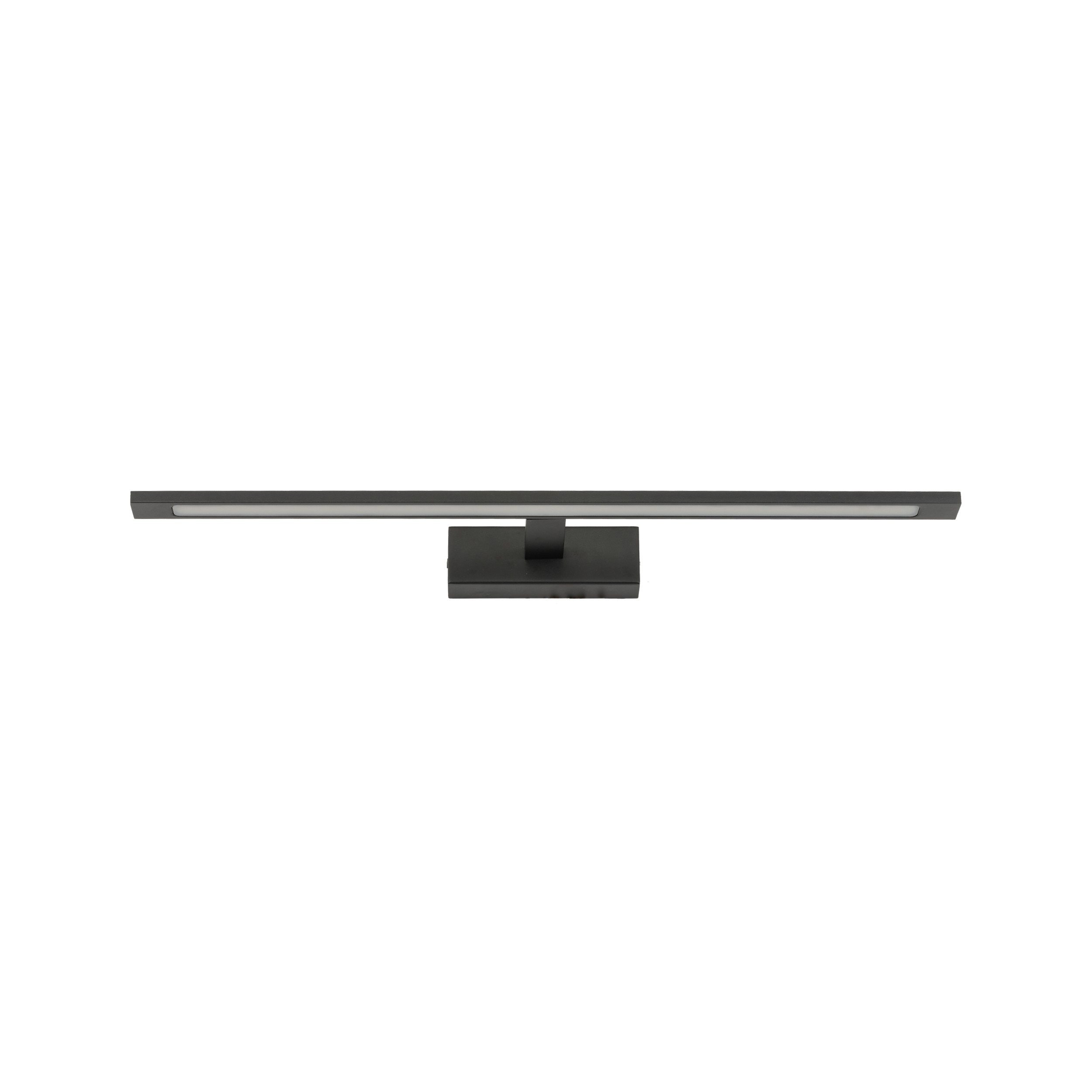 Badezimmerlampe über dem Spiegel. Es besteht aus Metall und Acryl. Es erstrahlt in einem neutralen Weiß. |