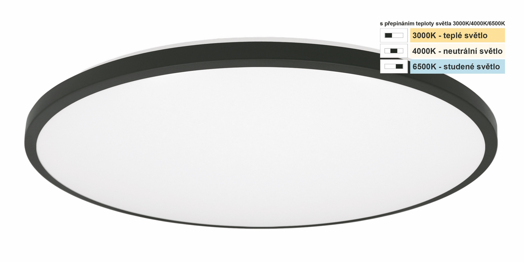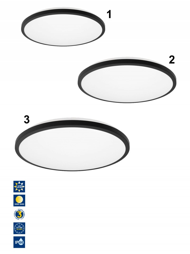 Elegante Deckenleuchte aus Metall und Kunststoff. Der Metallsockel ist schwarz und der Kunststoffdiffusor ist weiß. Dank IP 44-Schutz ist die Lampe für Feuchträume wie Badezimmer, Toiletten, aber auch für Flure, Schlafzimmer usw. geeignet. Möglichkeit zur Umstellung der Lichtfarbe 3000K/4000K/6500K.