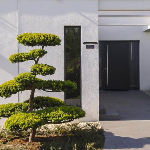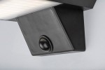 Solarwandleuchte mit Bewegungssensor. Es besteht aus Kunststoff mit weißem Schirm. Es leuchtet nach unten. Es erstrahlt in einem neutralen Weiß. Es eignet sich zur Beleuchtung von Gehwegen. |