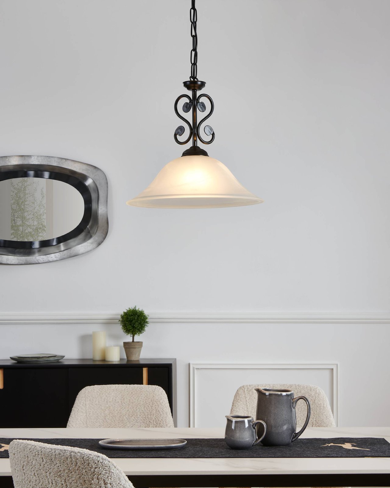 Die Leuchten im klassischen Murcia-Stil bestehen aus schwarzem Stahl und weißem Alabasterglas. Sie eignen sich besonders für Küchen und Esszimmer, aber auch für Wohnzimmer. |