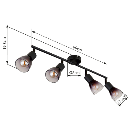 GL-54312-4 Stropní svítidlo, kov černý matný, sklo kouřové a průhledné, otočné/naklápěcí, Dx?xV:600x80x195mm, bez žárovek 4xE14,max. 25W 230V -