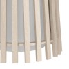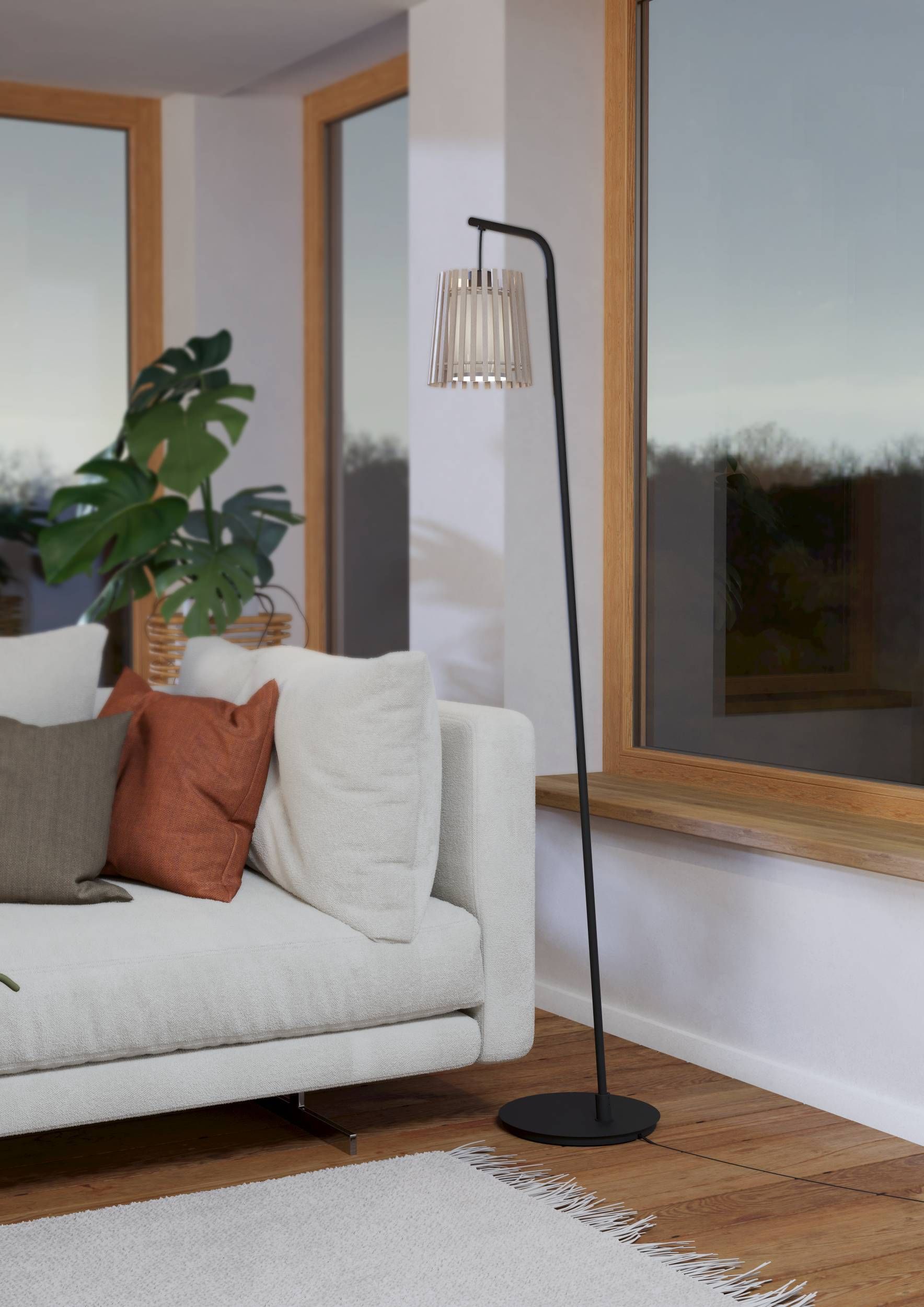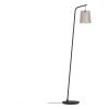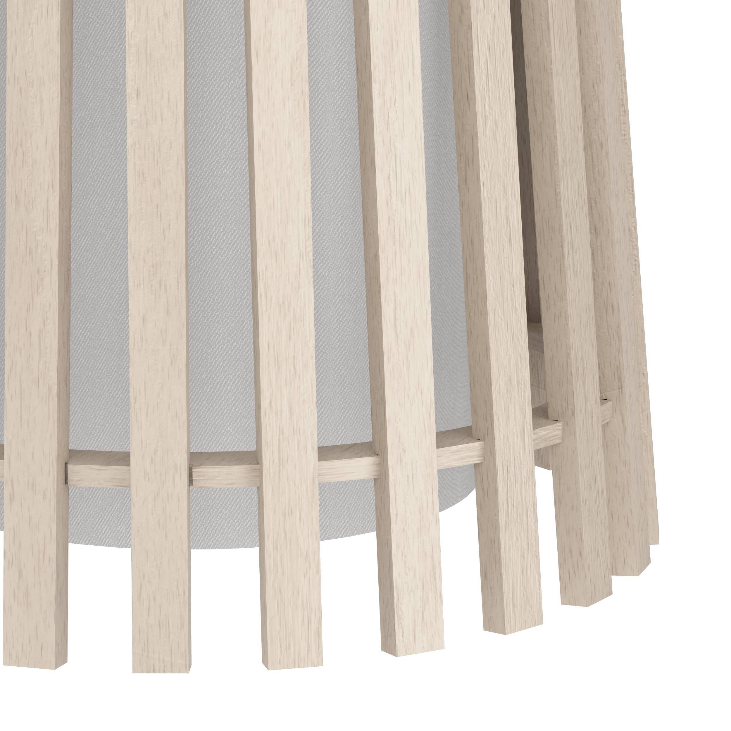 Die Fattoria-Lampen haben ein schwarzes Stahlbein und einen Holz- und Textilschirm in Natur und Weiß.