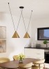 Moderne Pendelleuchte aus der Familie Narices. Ein interessantes Element für Ihr Wohnzimmer, Esszimmer oder Ihren Flur. Die Lampe ist aus Stahl in Schwarz, Gold und gebürstetem Stahl gefertigt. |