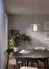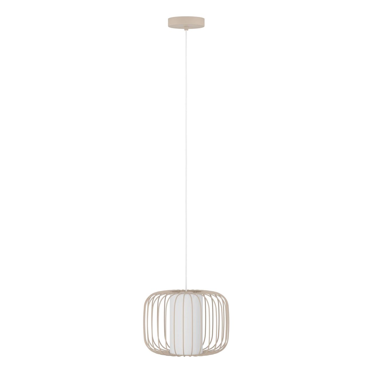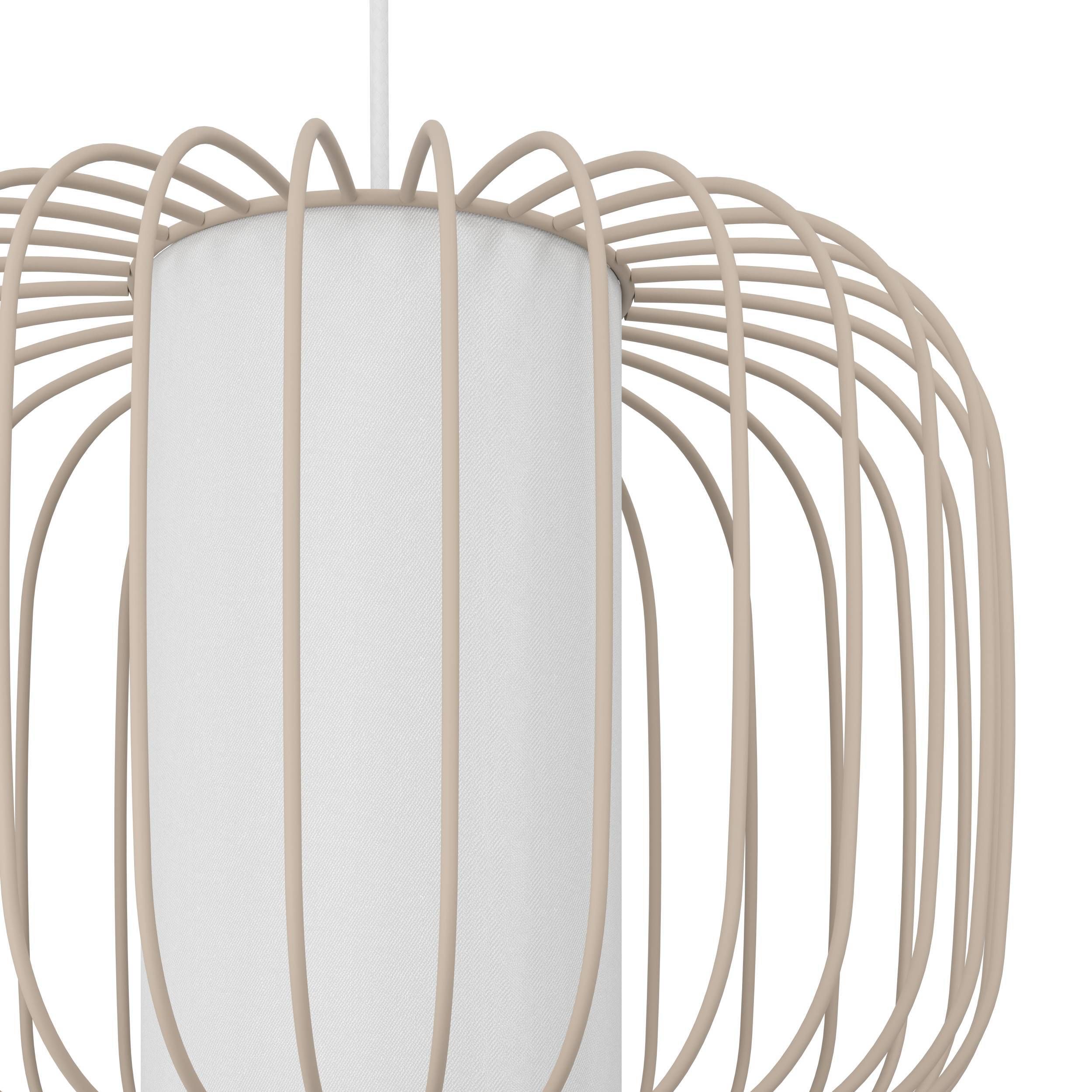 Moderne Pendelleuchte aus sandfarbenem Stahl mit einem weißen Textilzylinder in der Mitte eines Metallschirms. |