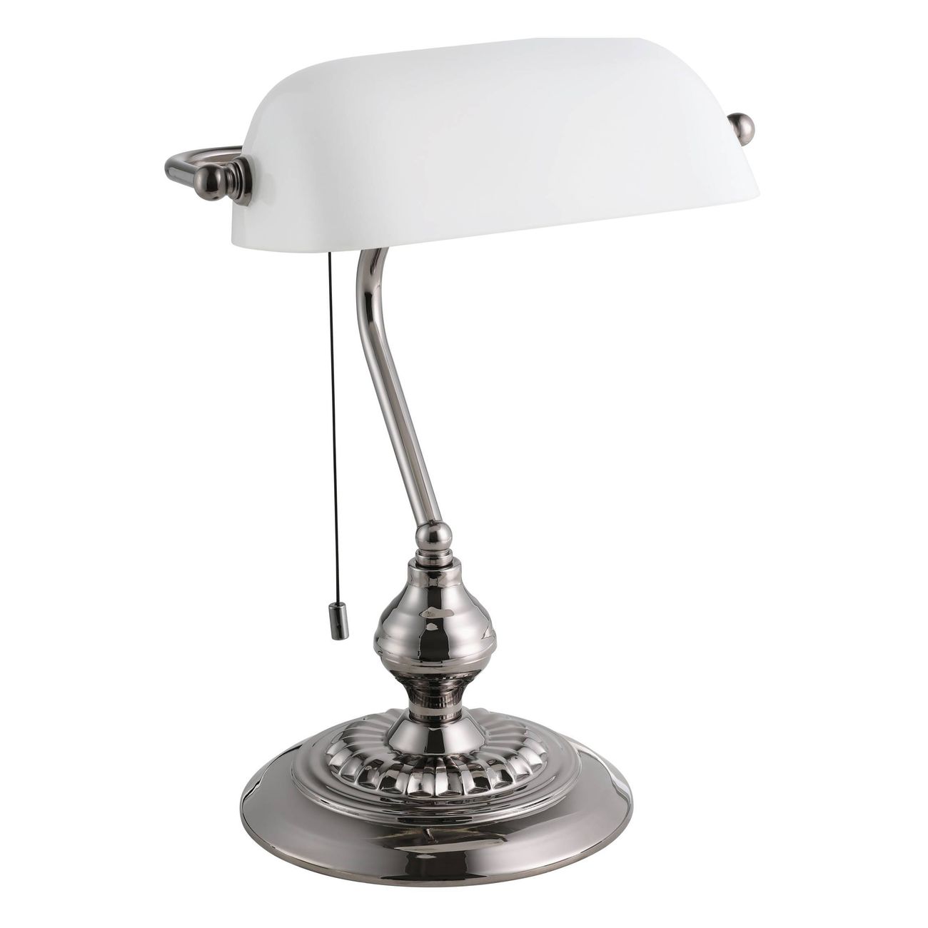 Tischlampe, geeignet für Büros und Arbeitszimmer. Bankstil. Sie besteht aus Metall in der Farbe Nero Nickel matt und der Schirm besteht aus weiß satiniertem Glas. Mit Ein-/Ausschalter. |