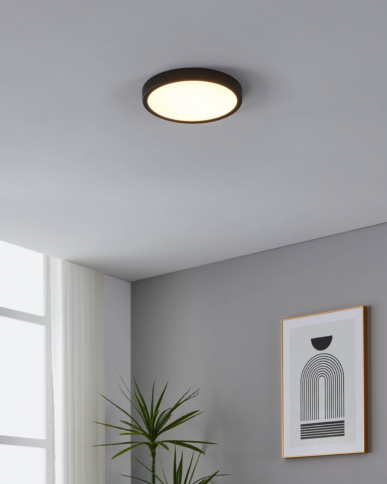 Die schlichte Deckenleuchte ist aus Stahl und Kunststoff gefertigt. Inklusive Bewegungssensor.