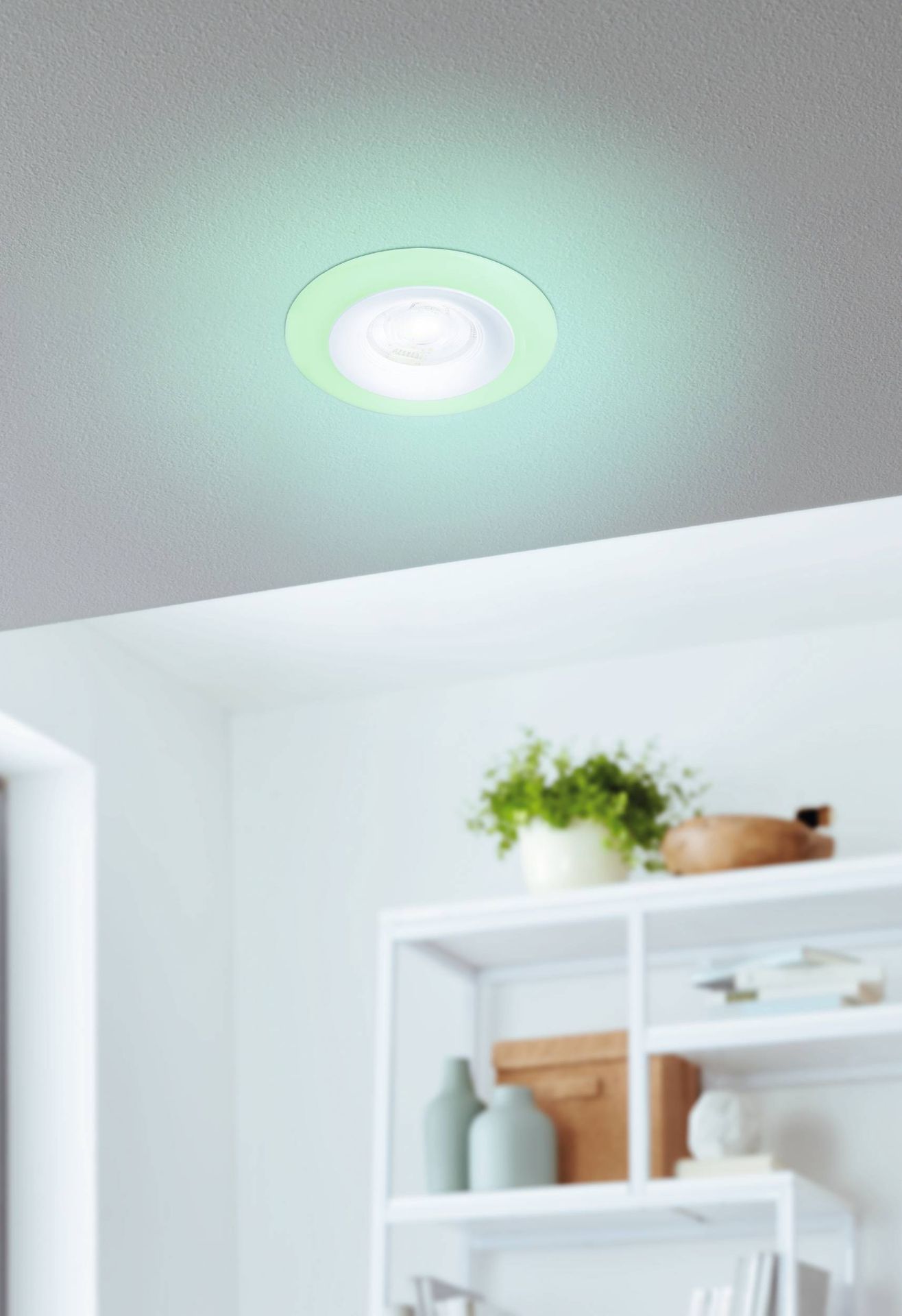 Deckenstrahler aus Kunststoff. Im Lieferumfang ist eine Fernbedienung enthalten, mit der sich die Lampe dimmen und das RGB-Farbspektrum verändern lässt. Dank IP44 sind sie auch für Feuchträume wie Badezimmer etc. geeignet, sodass Sie auch hier für eine angenehme Atmosphäre sorgen können.