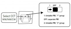MODE 1 - Gruppenschaltung von Leuchten mit identischer Betriebsart (1). Die Leuchte, die eine Bewegung erkennt, schaltet sich ein und schaltet gleichzeitig alle Leuchten ein, für die wir die Betriebsart 1 eingestellt haben (sendet einen Funkimpuls an diese Leuchten)