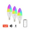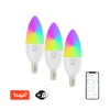 Protokol: Wi-Fi, Beacon Frekvence: 2400MHz~2483.5MHz Maximální RF výstupní výkon: WiFi: 20dBm Příkon: 6W Síťové pohotovostní napájení (Pnet): 0,4W Patice: E14 Materiál těla žárovky:plast Barva světla: CCT + RGB Barevná teplota: 2700K-6500K Světelný tok: 470lm (v kouli 360°) Úhel světelného paprsku: 200° Vstupní napětí: AC 230V Průměrná životnost: 25.000 hodin Index podání barev:>80Ra Rozměry: 3,7cm x 10,6mm Odpovídá klasické žárovce: 40W Počet spínacích cyklů: 100.000 Okamžité rozsvícení Energetická třída(EEI): F Účiník (Power factor): >0.5 Možnost stmívání: ANO Certifikáty: CE Obsah balení: 3x LED žárovka, uživatelský manuál