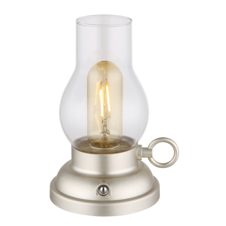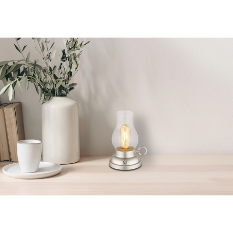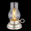 Dekorative Lampe aus Kunststoff mit Glasschirm. Die Lampe imitiert eine altmodische Petroleumlampe. Sie verfügt über einen Touch-Schalter. Ein Ladekabel ist im Lieferumfang enthalten. Die Lampe leuchtet auch während des Ladevorgangs. Sie leuchtet mit warmweißem Licht, was einen sehr angenehmen Eindruck macht. |