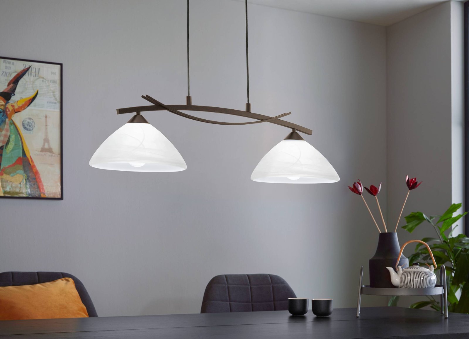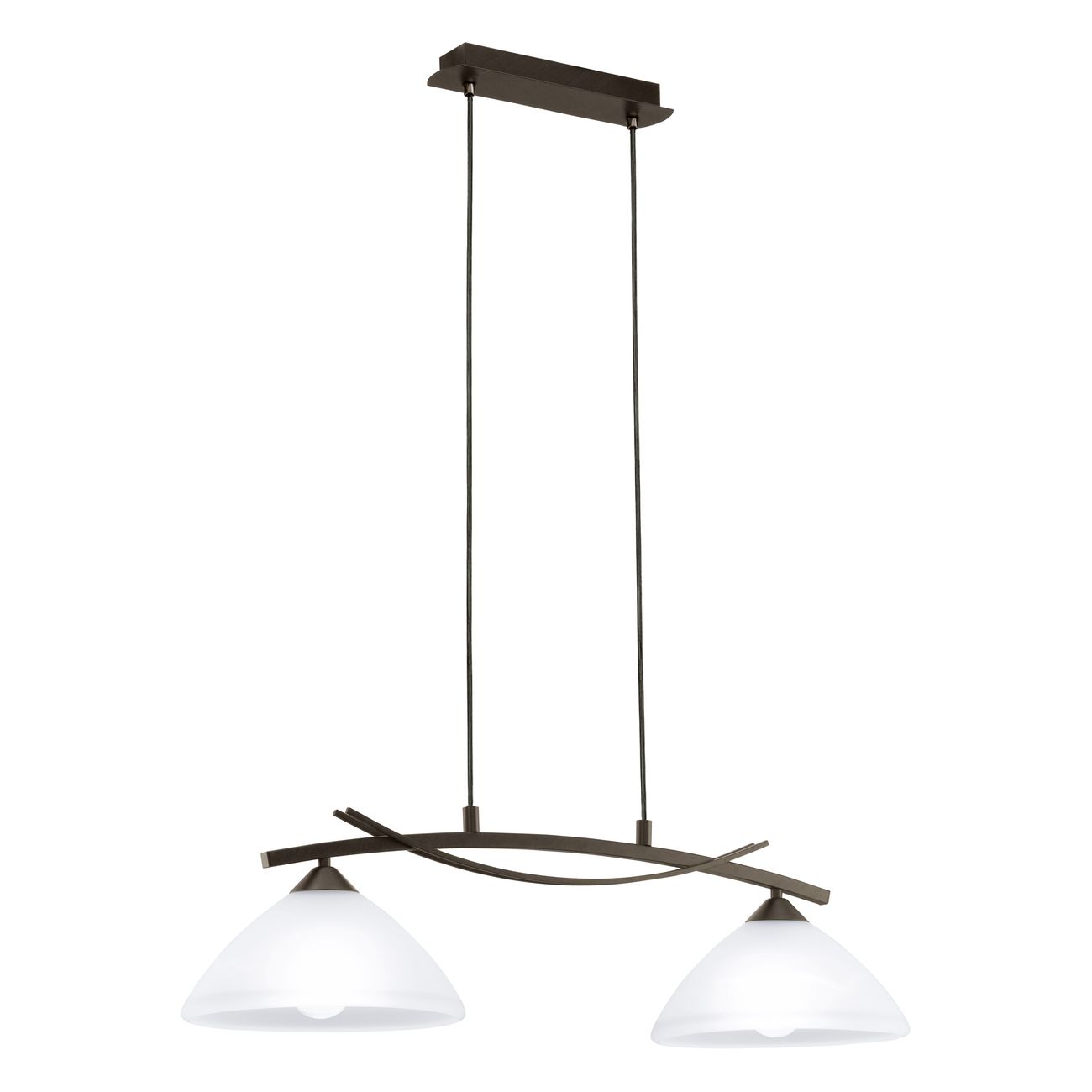 Hängelampe im klassischen Stil. Es eignet sich nicht nur für Küchen und Esszimmer über dem Esstisch, sondern auch für Wohnzimmer. Es besteht aus dunkelbraunem Stahl und weißem Alabasterglas. |