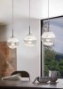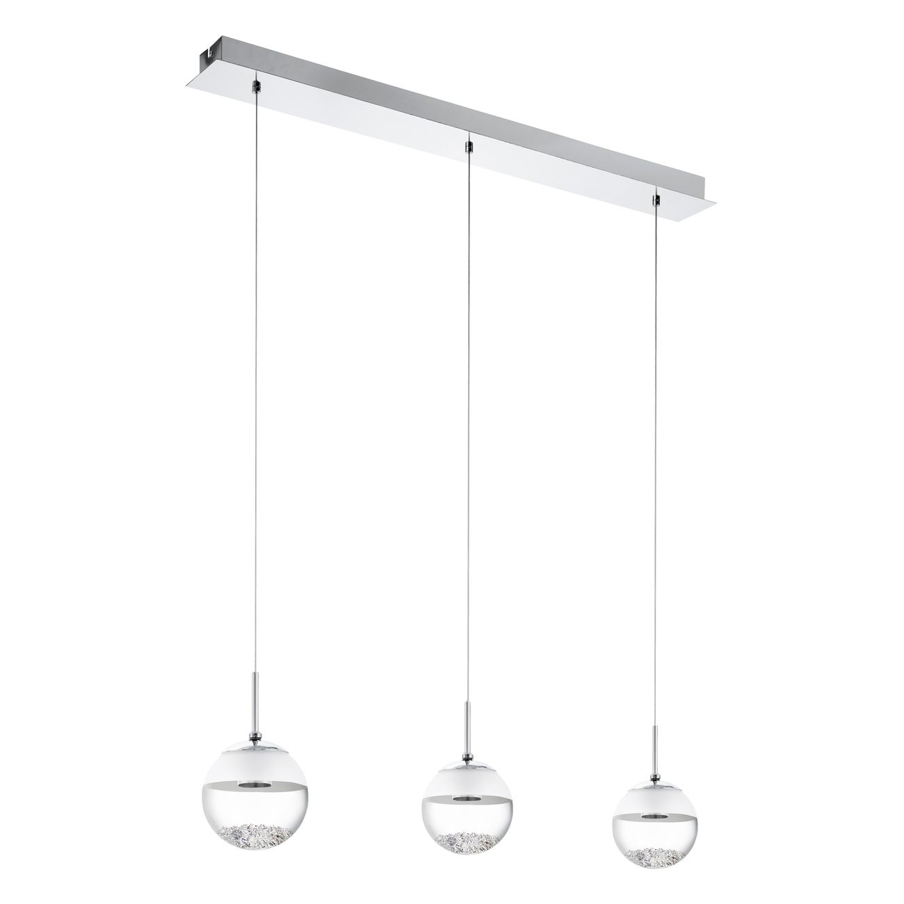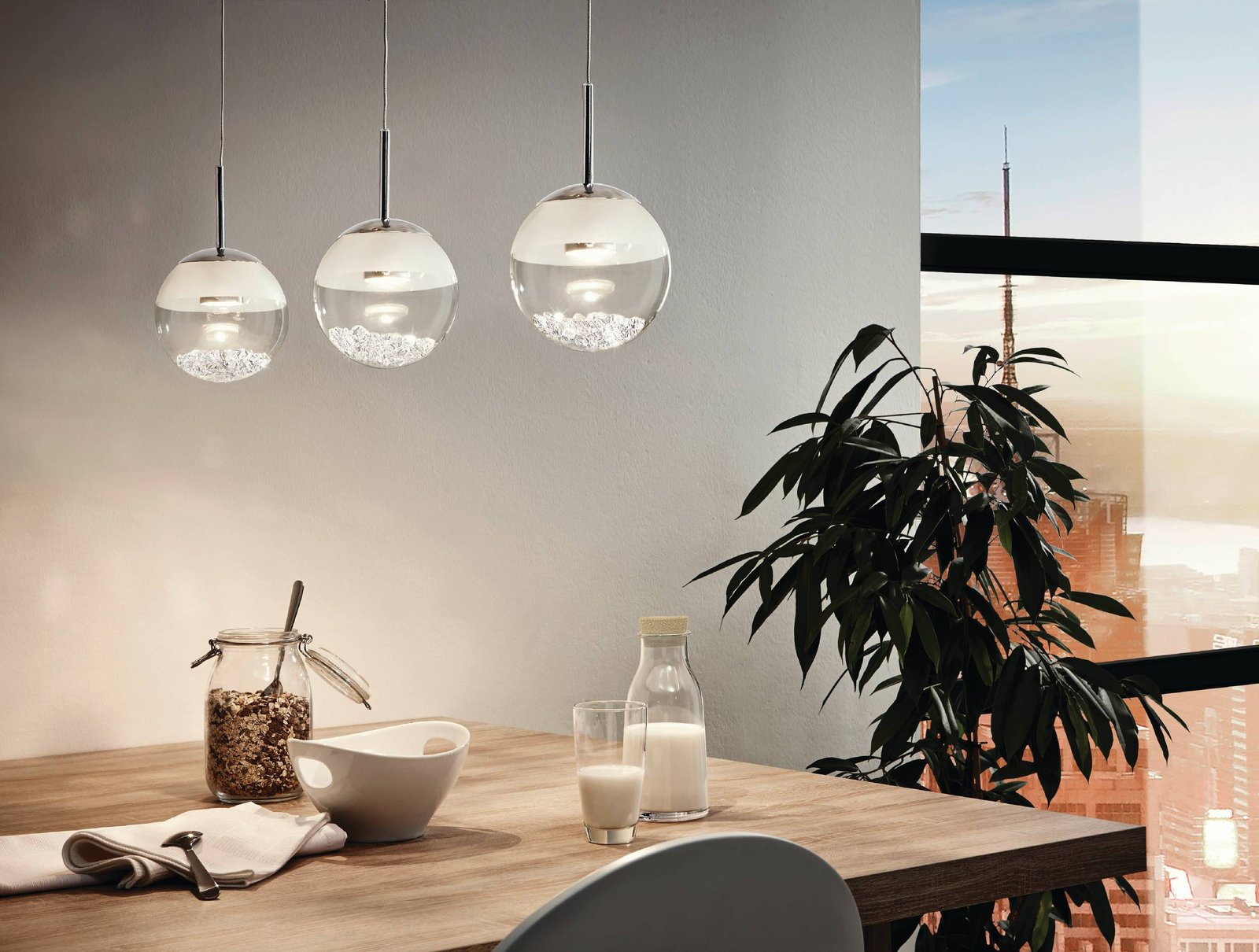 Die modernen Montefio 1 LED-Pendelleuchten bestehen aus chromfarbenem Stahl und der Lampenschirm ist eine weiße und klare Glaskugel mit kleinen Kristallen. Wenn sie angezündet werden, funkeln sie wunderschön und verleihen der Lampe ein luxuriöses Aussehen. Die Lampen strahlen in einem warmweißen Farbton und sind nicht dimmbar.