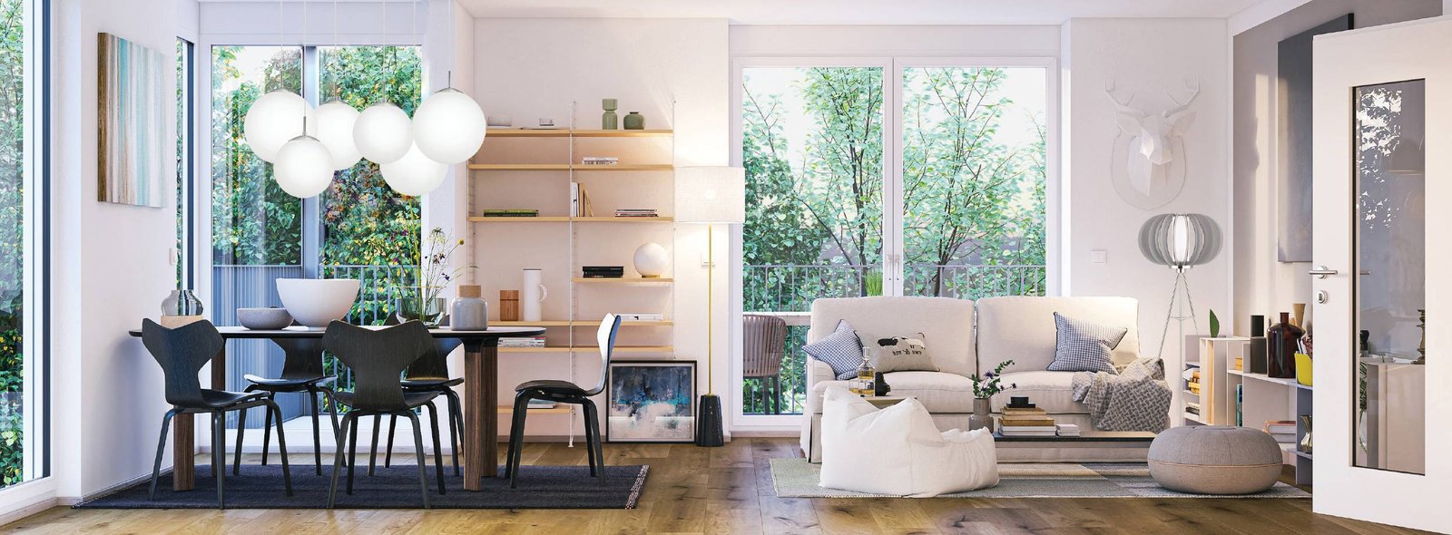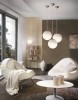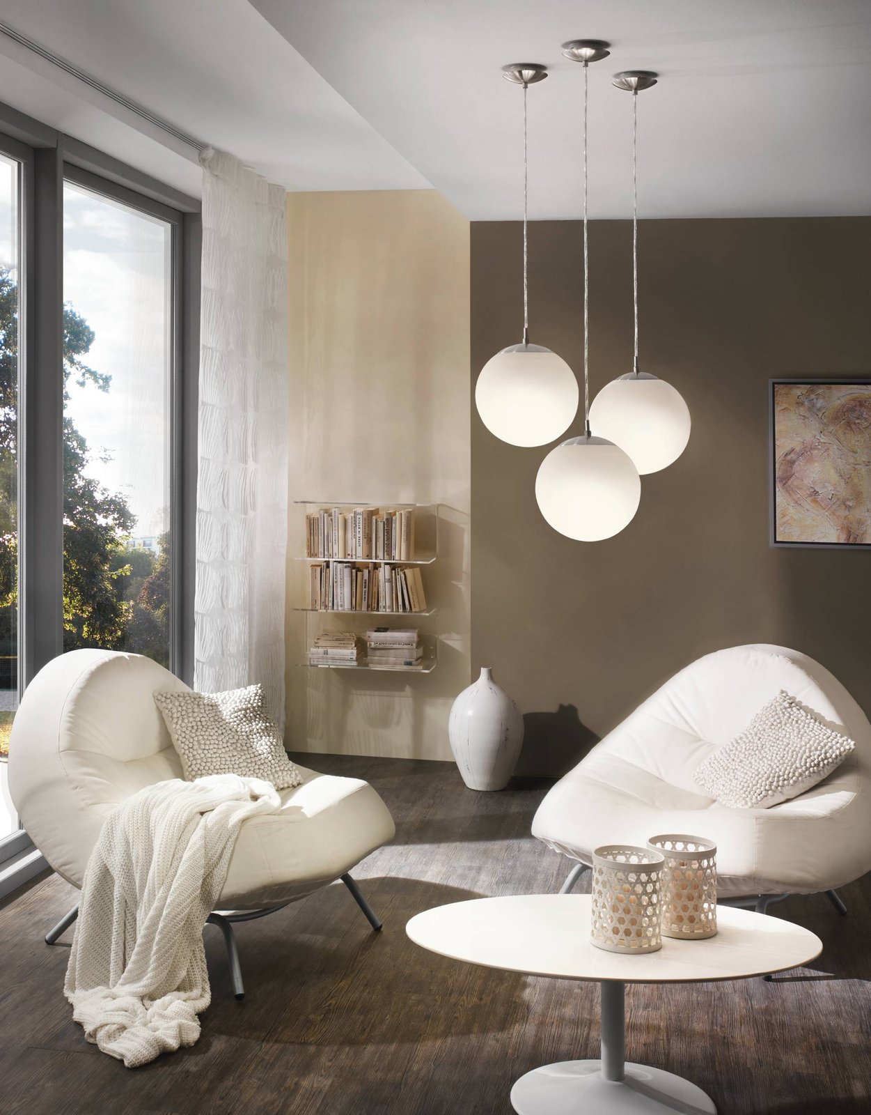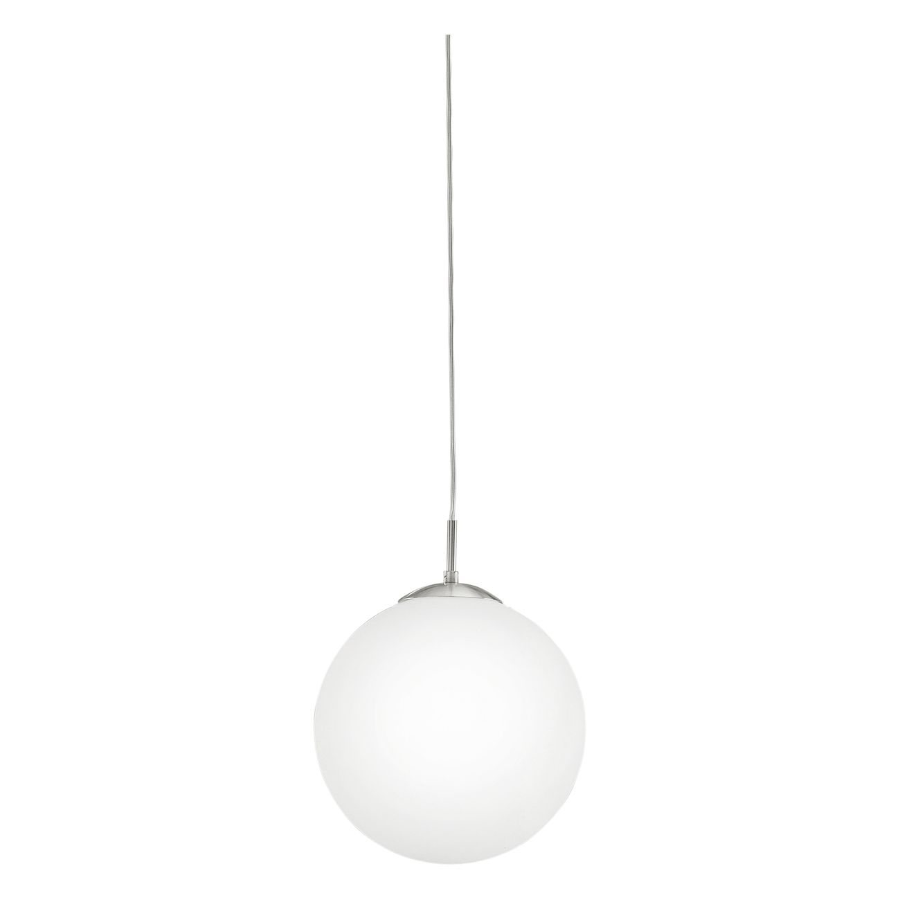 Ein modernes Lampenset aus Stahl in mattem Nickel und Opalglaskugeln in Weiß. |