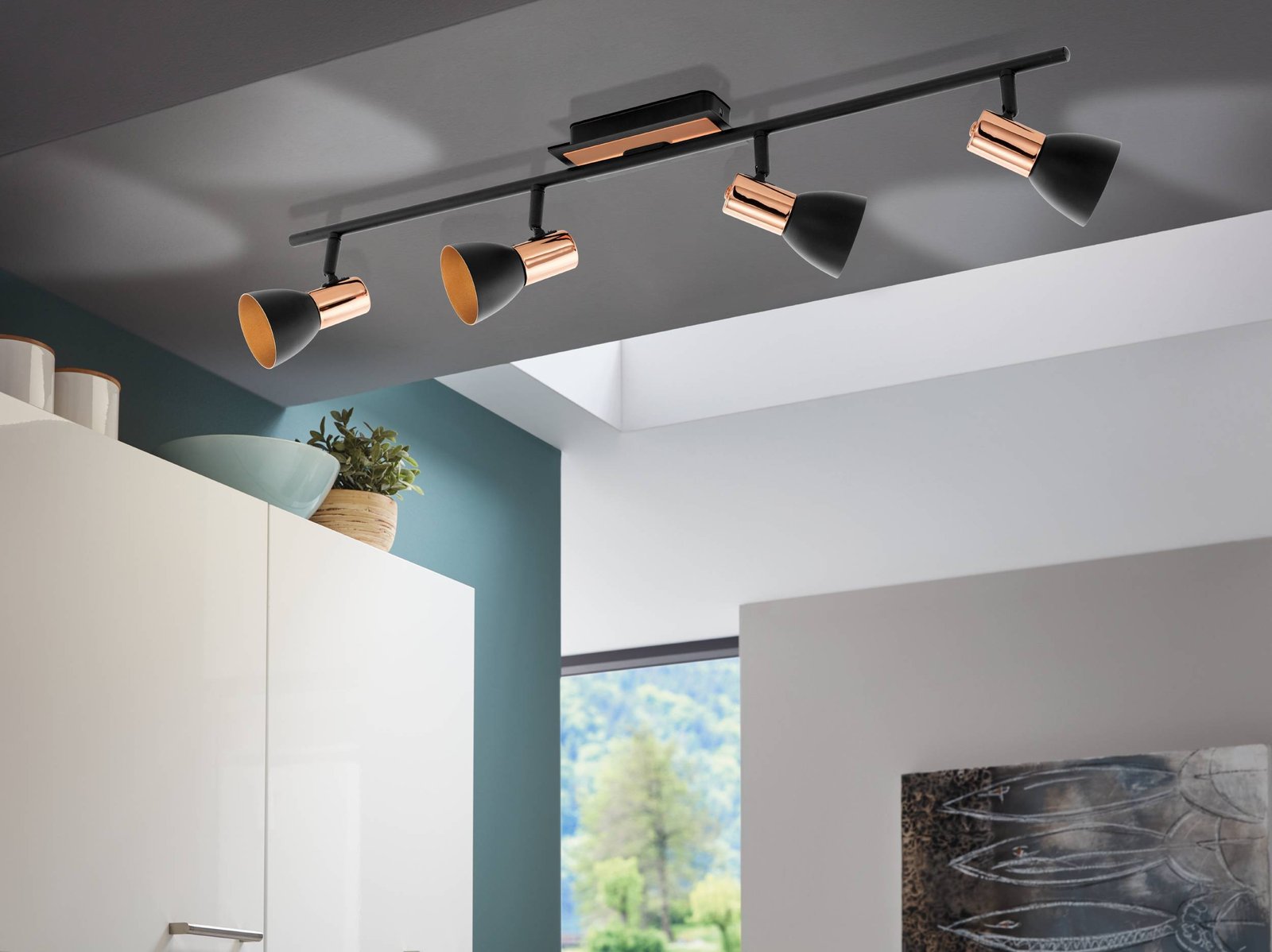 Interessante Strahler passend für jeden Raum Ihrer Wohnung. Sie beleuchtet wunderbar die Küche, das Wohnzimmer, den Flur oder das Kinderzimmer. Sie bestehen aus Stahl in einer Kombination aus Schwarz und Kupfer. |