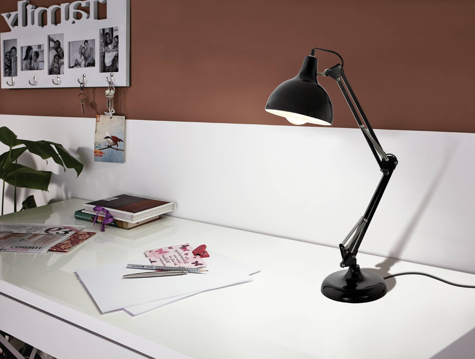 Die zeitlose Tischleuchte ist aus Stahl gefertigt. Dank drei Gelenken können Sie ihn genau dorthin drehen, wo Sie strahlen möchten. |