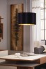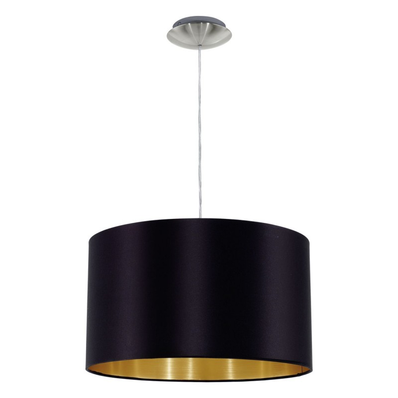 Maserlo sind Lampen in modernem Design. Sie bestehen aus Stahl in der Farbe Mattnickel und der Lampenschirm ist aus Textil, innen goldfarben und außen schwarz. |