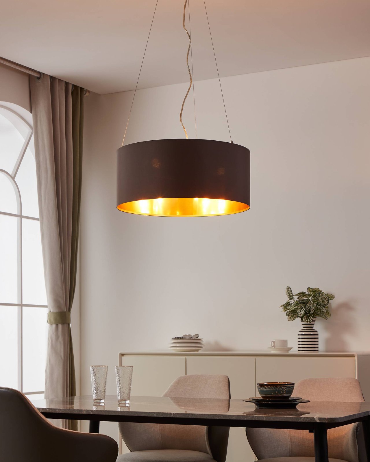 Moderne Lampen aus Stahl in der Farbe Nickel matt und Lampenschirme aus Textil in den Farben Cappuccino und Gold. Sie eignen sich für alle Wohnräume in Ihrem Interieur. Es besteht die Möglichkeit, sie mit einer smarten LED-Glühbirne auszustatten und sie per Smartphone-App zu dimmen oder die Temperatur und Farbe der Beleuchtung zu ändern. |