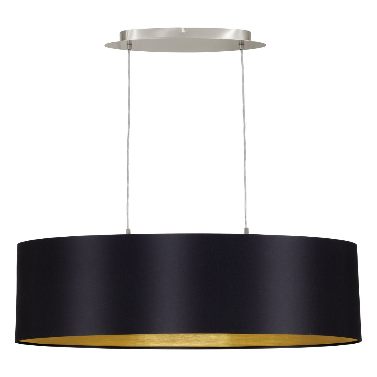 Maserlo sind Lampen in modernem Design. Sie bestehen aus Stahl in der Farbe Mattnickel und der Lampenschirm ist aus Textil, innen goldfarben und außen schwarz. |