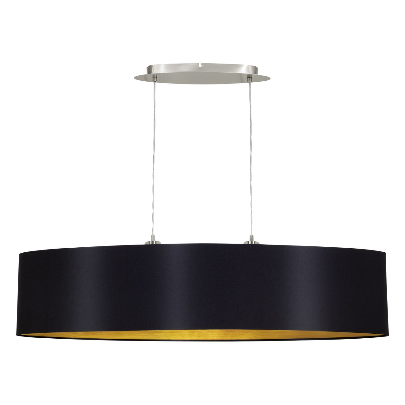 Maserlo sind Lampen in modernem Design. Sie bestehen aus Stahl in der Farbe Mattnickel und der Lampenschirm ist aus Textil, innen goldfarben und außen schwarz. |