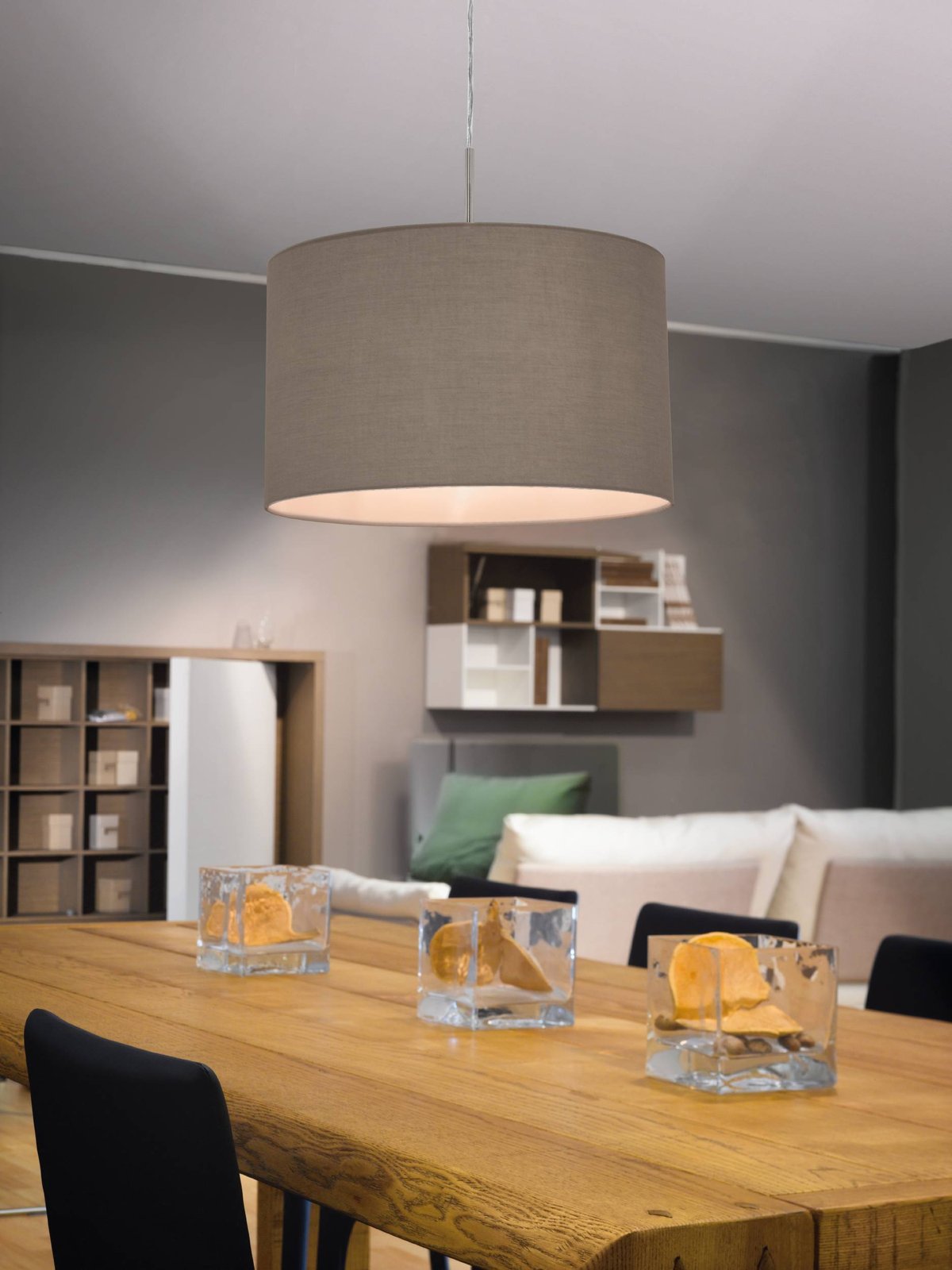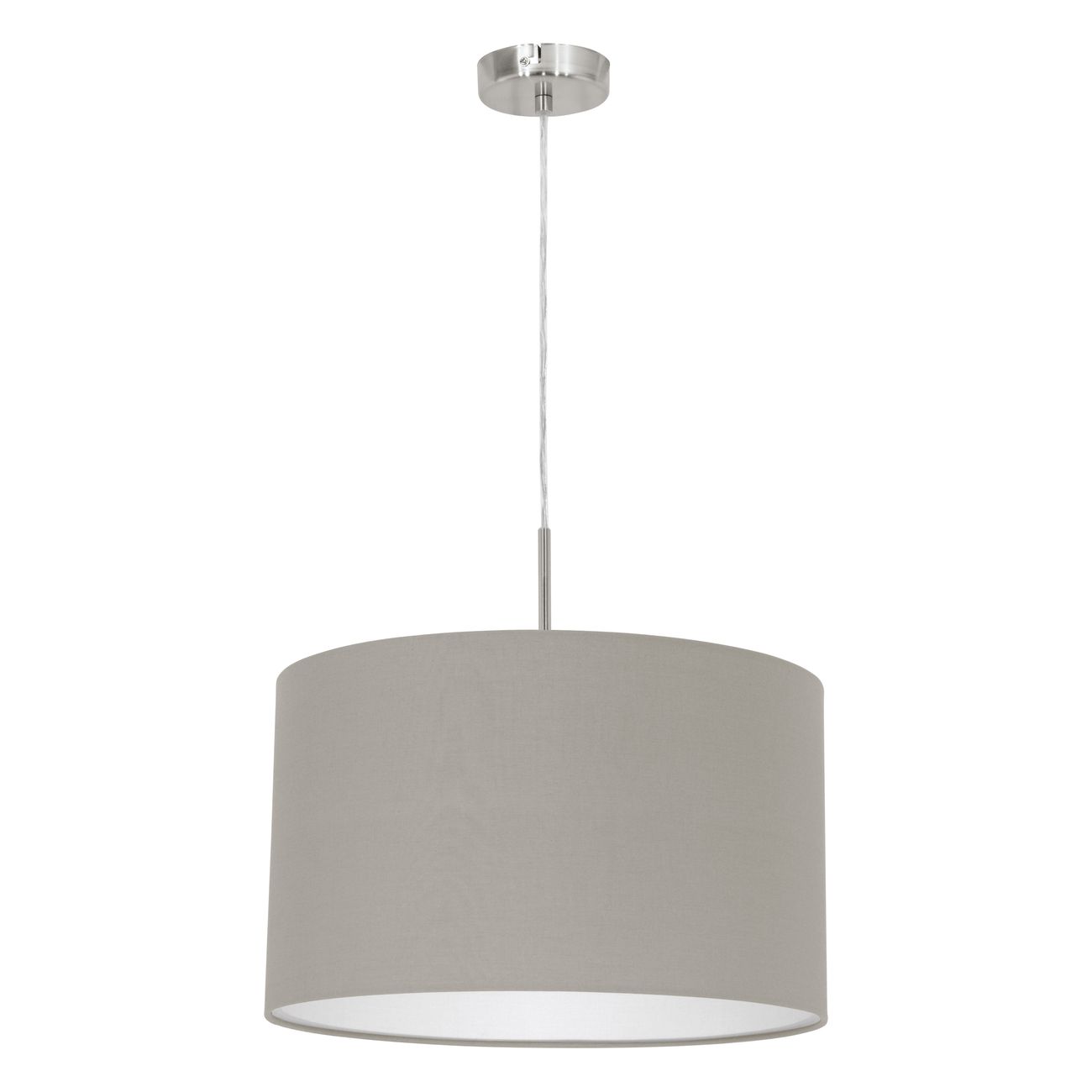 Moderne Leuchten aus Metall in mattem Nickel und Textil in Taupe. Das Pasteri-Set besteht aus Tabletts, Lampen, Kronleuchtern und Wandleuchten, so dass Sie eine komplette Einrichtung erhalten. |